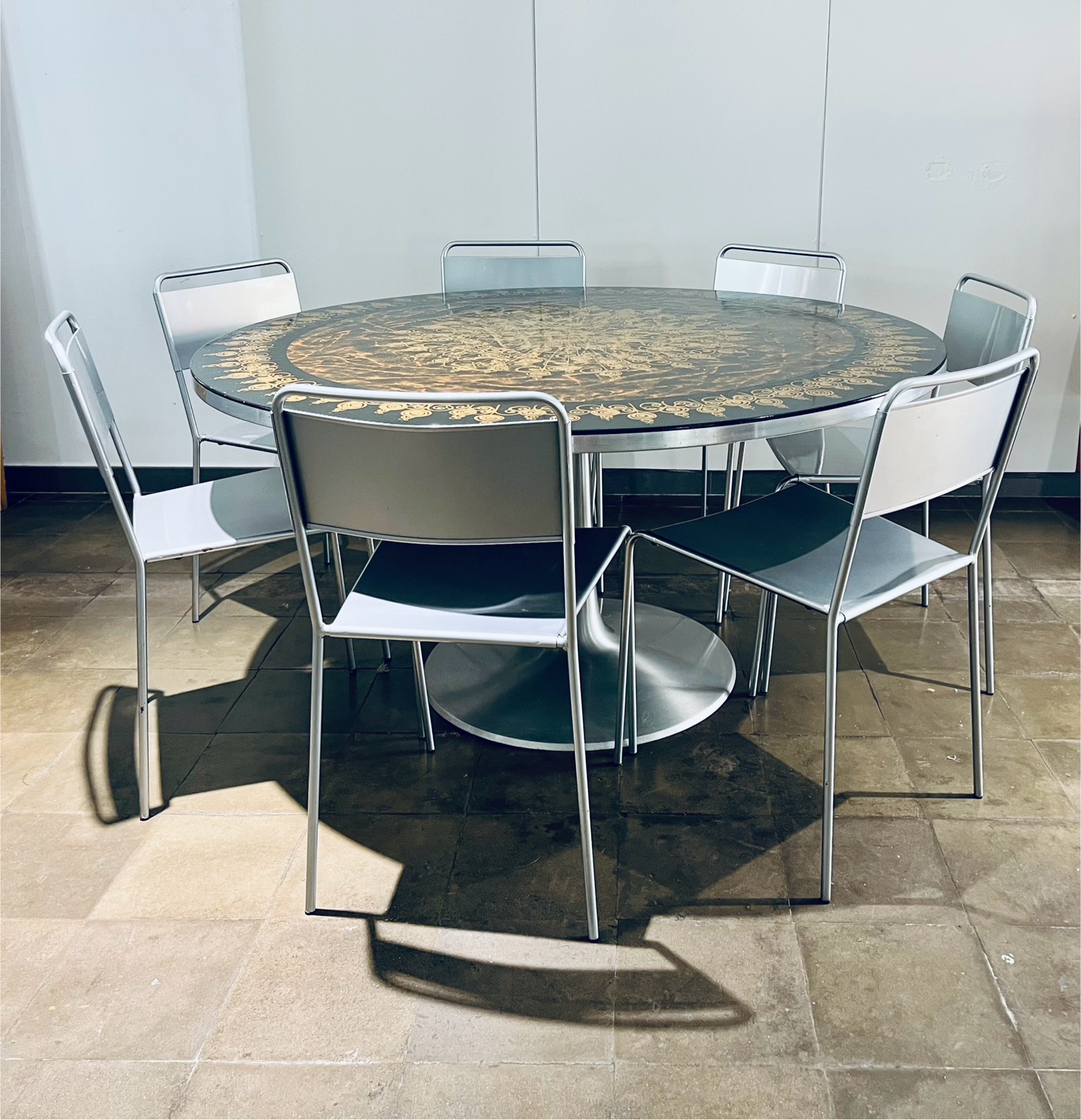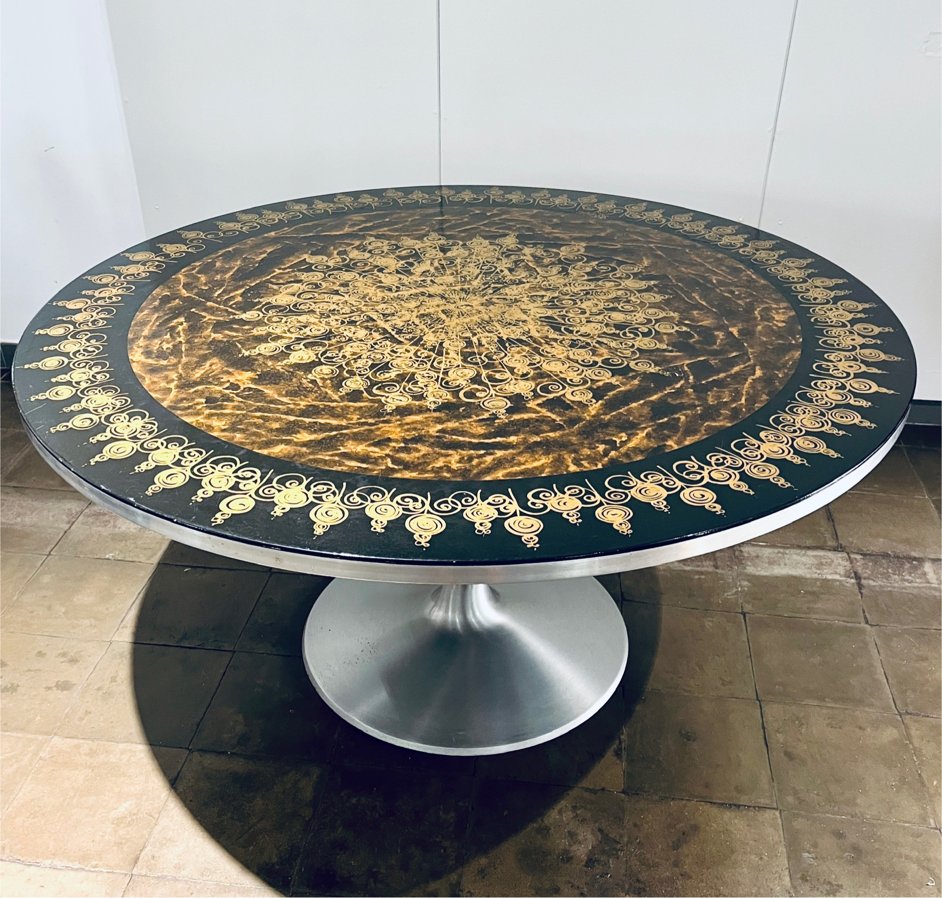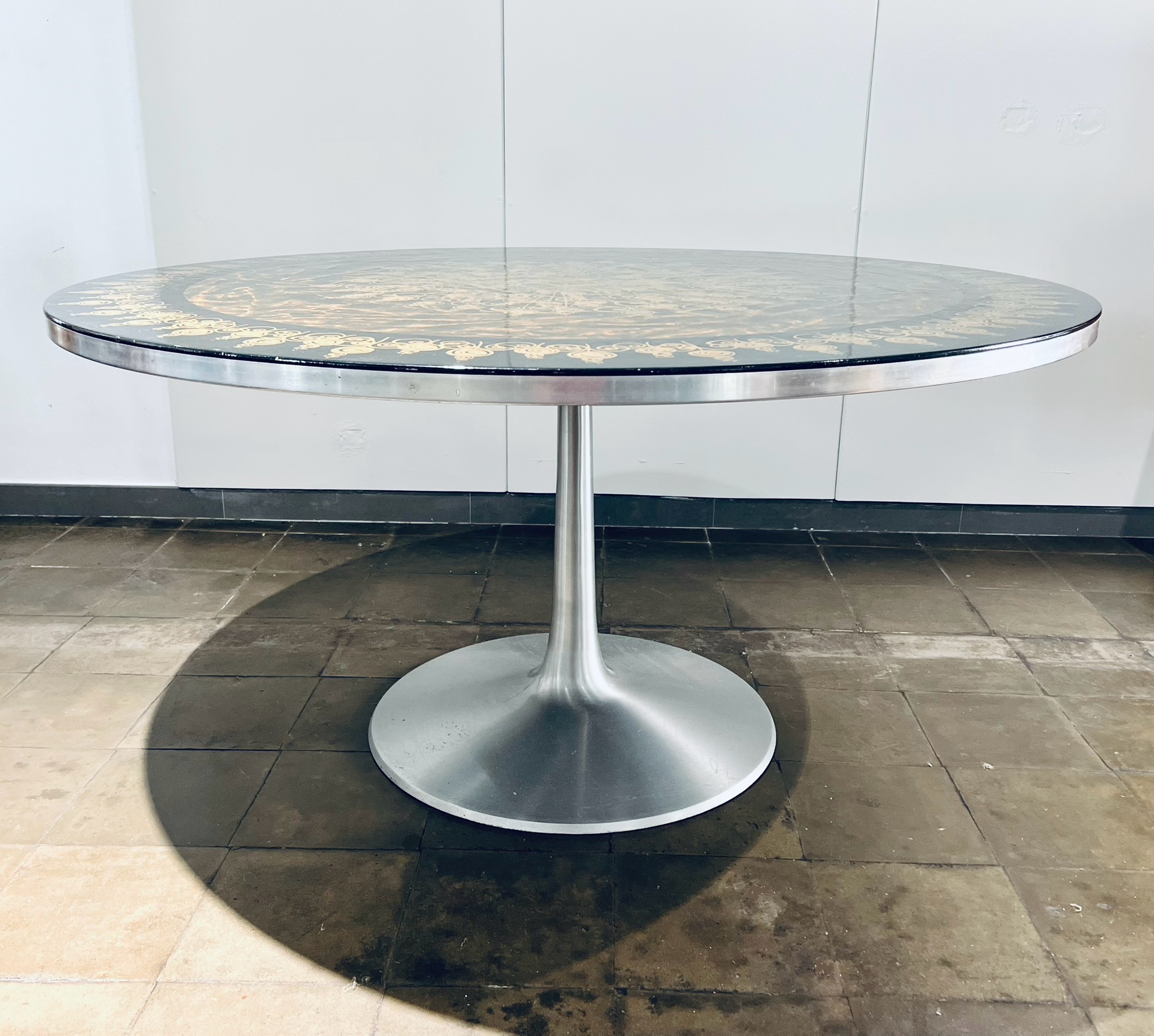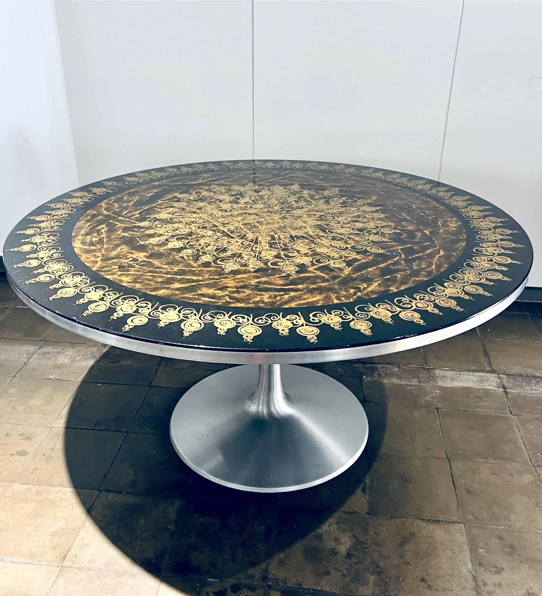 Gran Mesa de comedor, serie “Mosquito” de Poul Cadovius para Cado. Dinamarca años 60. Un pie de trompeta en aluminio cepillado, soporta una tapa de madera plastificada con anillo de aluminio. Y un fascinante trazado a mano alzada, con esmalte acrílico, diseñado y firmado por Susan Fjedldoe Mygge, decora su amplia superficie. Arte y diseño para esta hermosa pieza, la de mayor tamaño de una serie que cuenta con mesa de centro y de comedor de 118cm.
