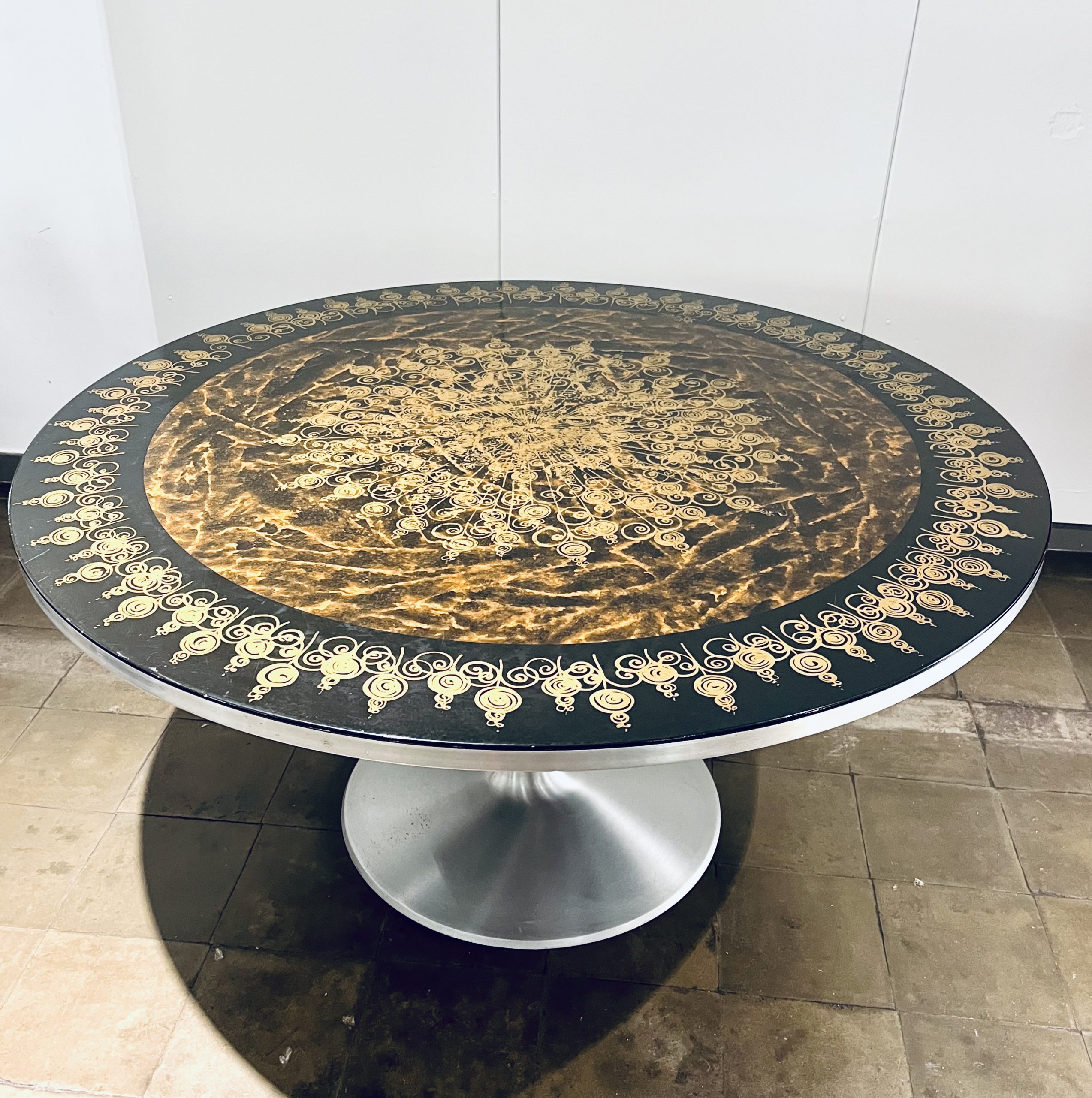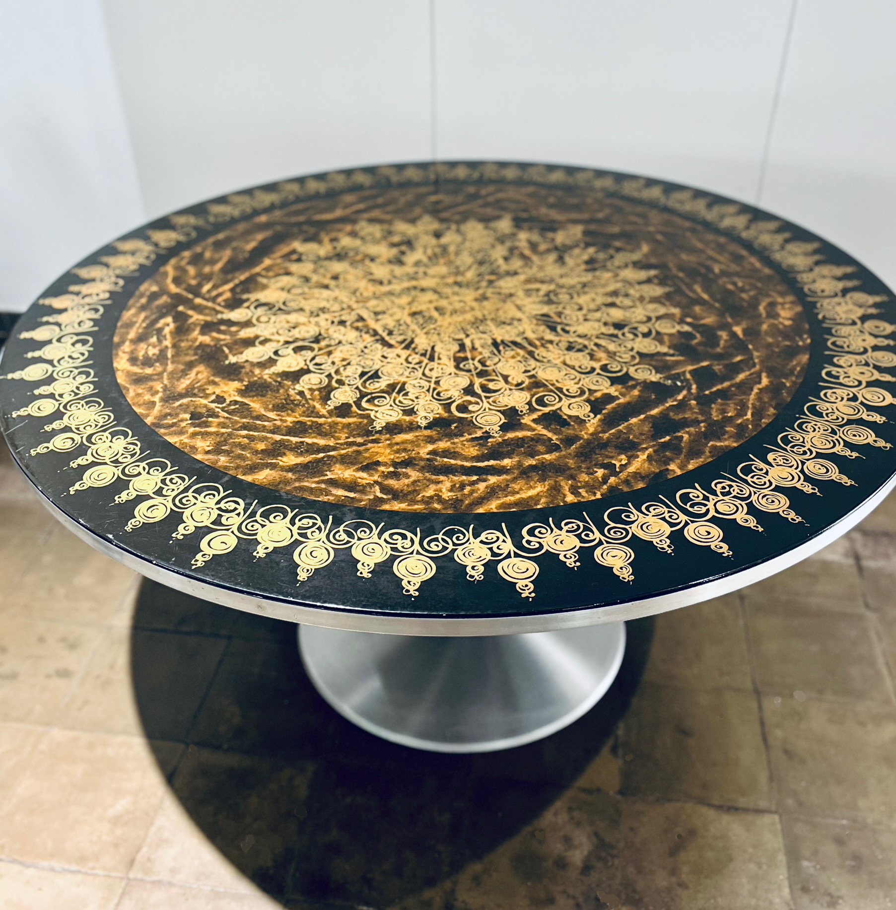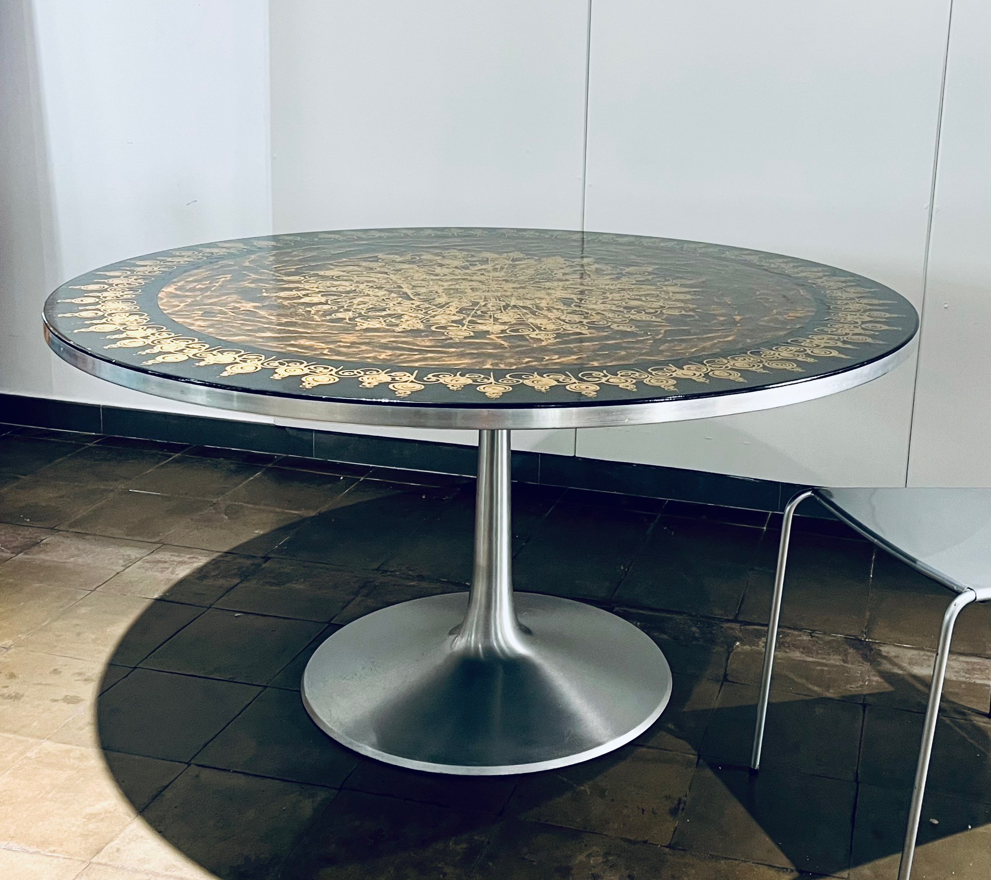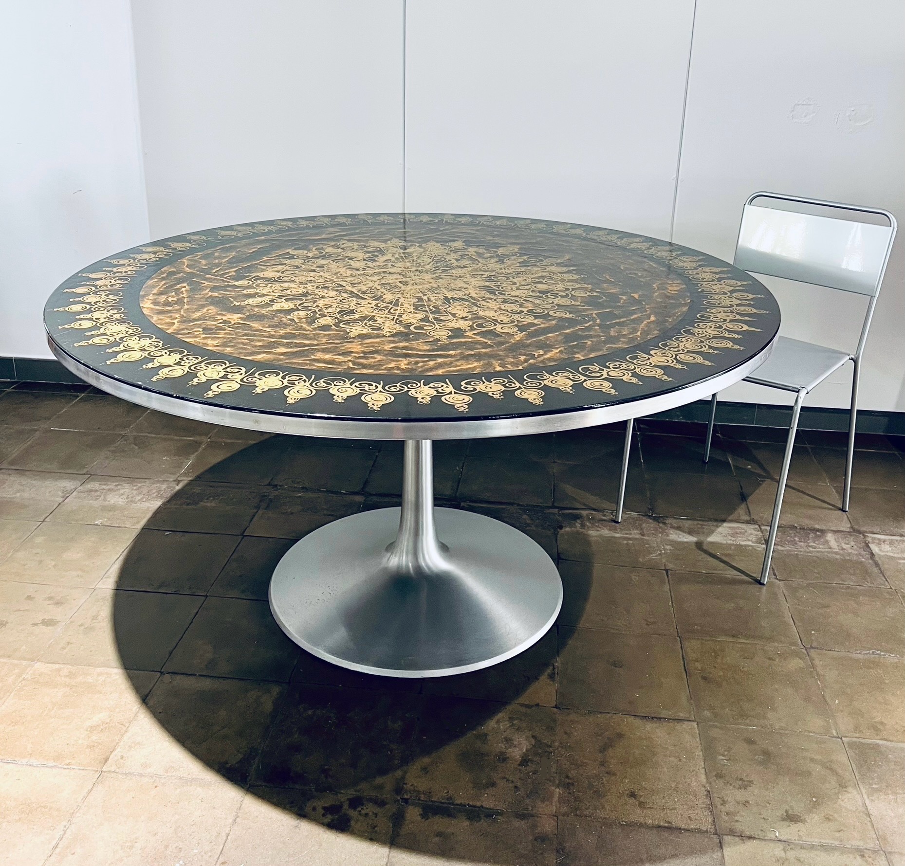 Gran Mesa de comedor, serie “Mosquito” de Poul Cadovius para Cado. Dinamarca años 60. Un pie de trompeta en aluminio cepillado, soporta una tapa de madera plastificada con anillo de aluminio. Y un fascinante trazado a mano alzada, con esmalte acrílico, diseñado y firmado por Susan Fjedldoe Mygge, decora su amplia superficie. Arte y diseño para esta hermosa pieza, la de mayor tamaño de una serie que cuenta con mesa de centro y de comedor de 118cm.