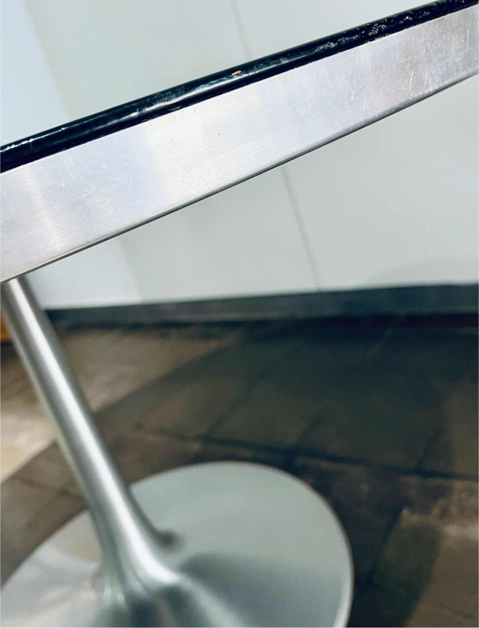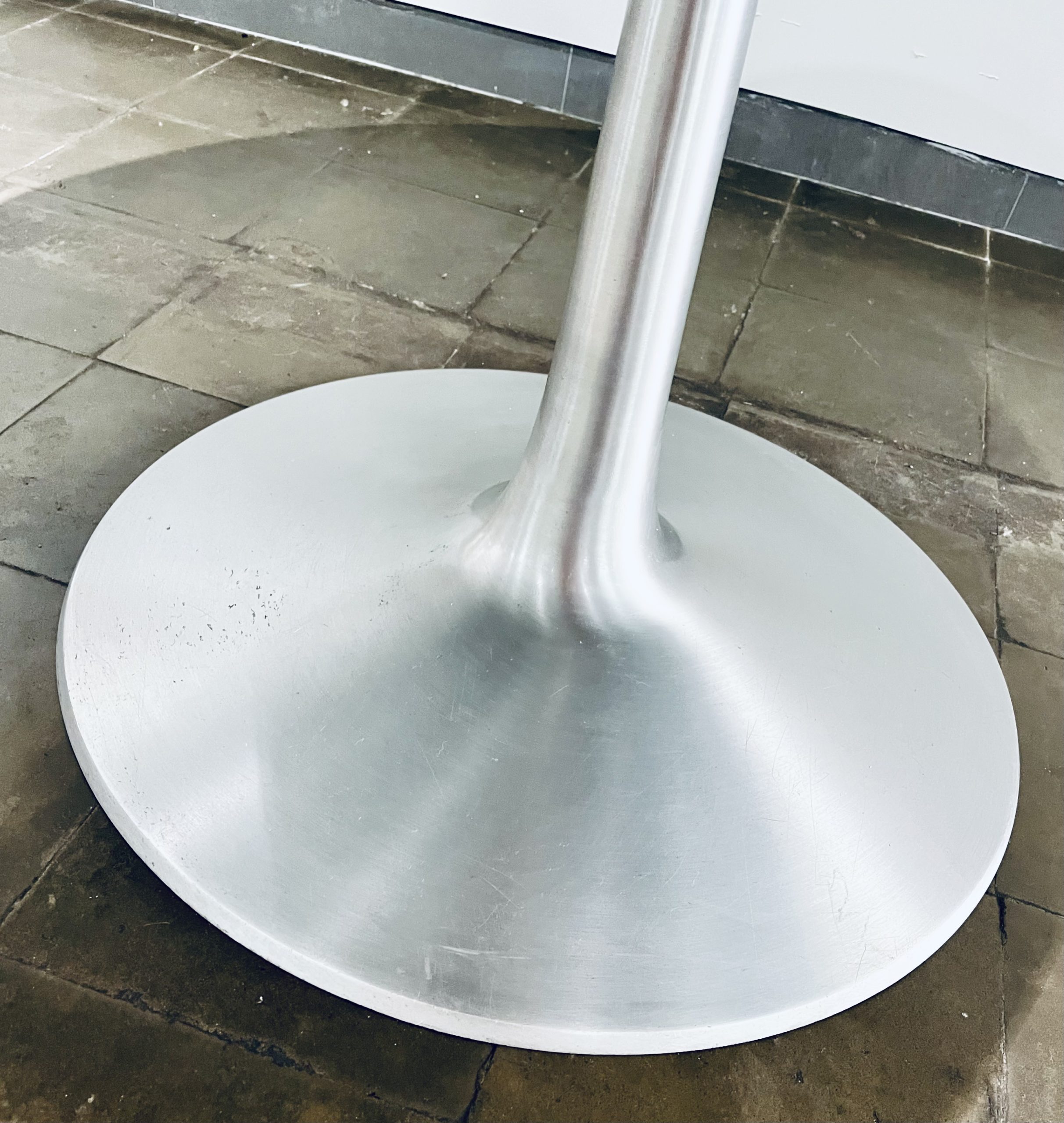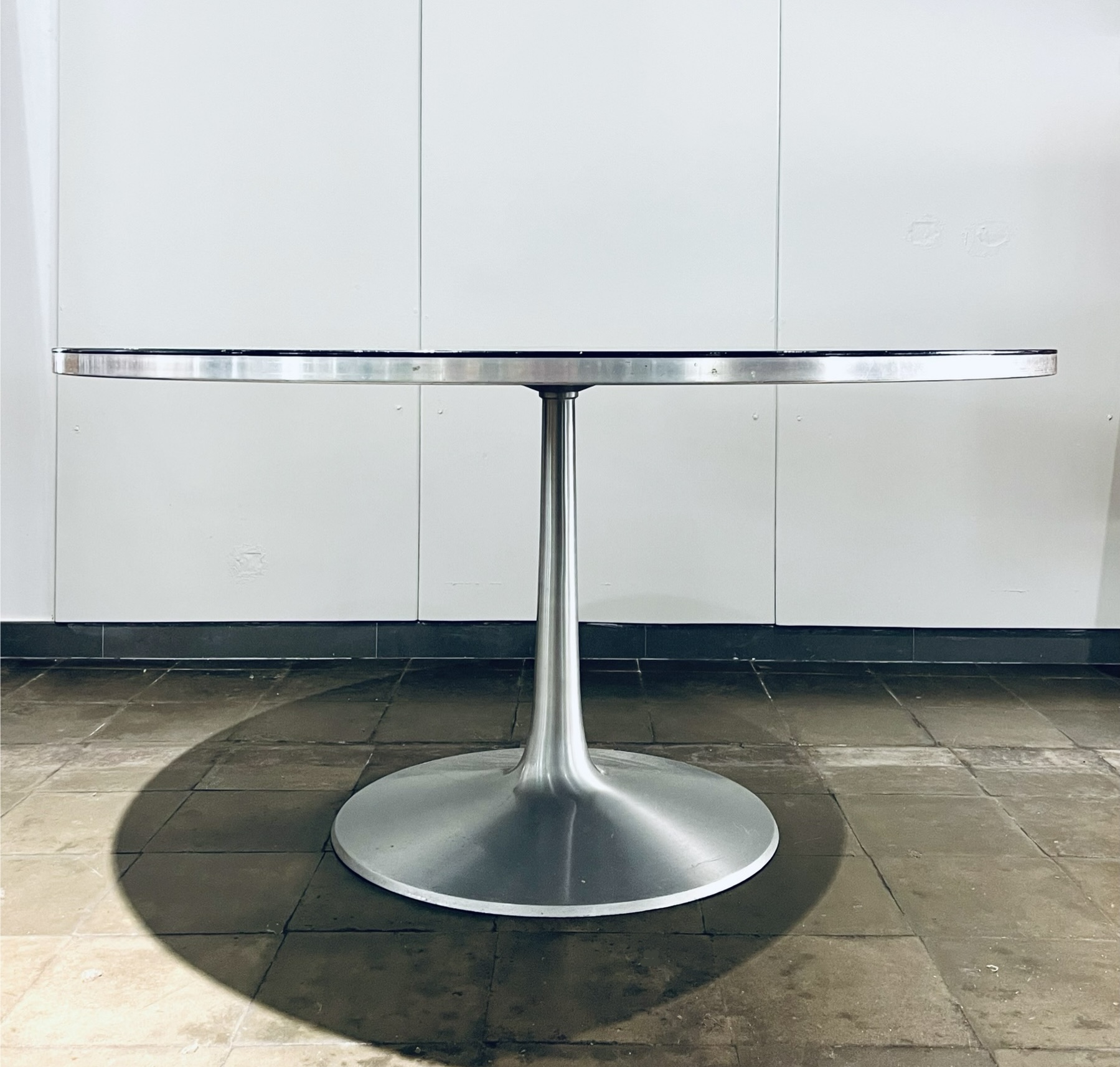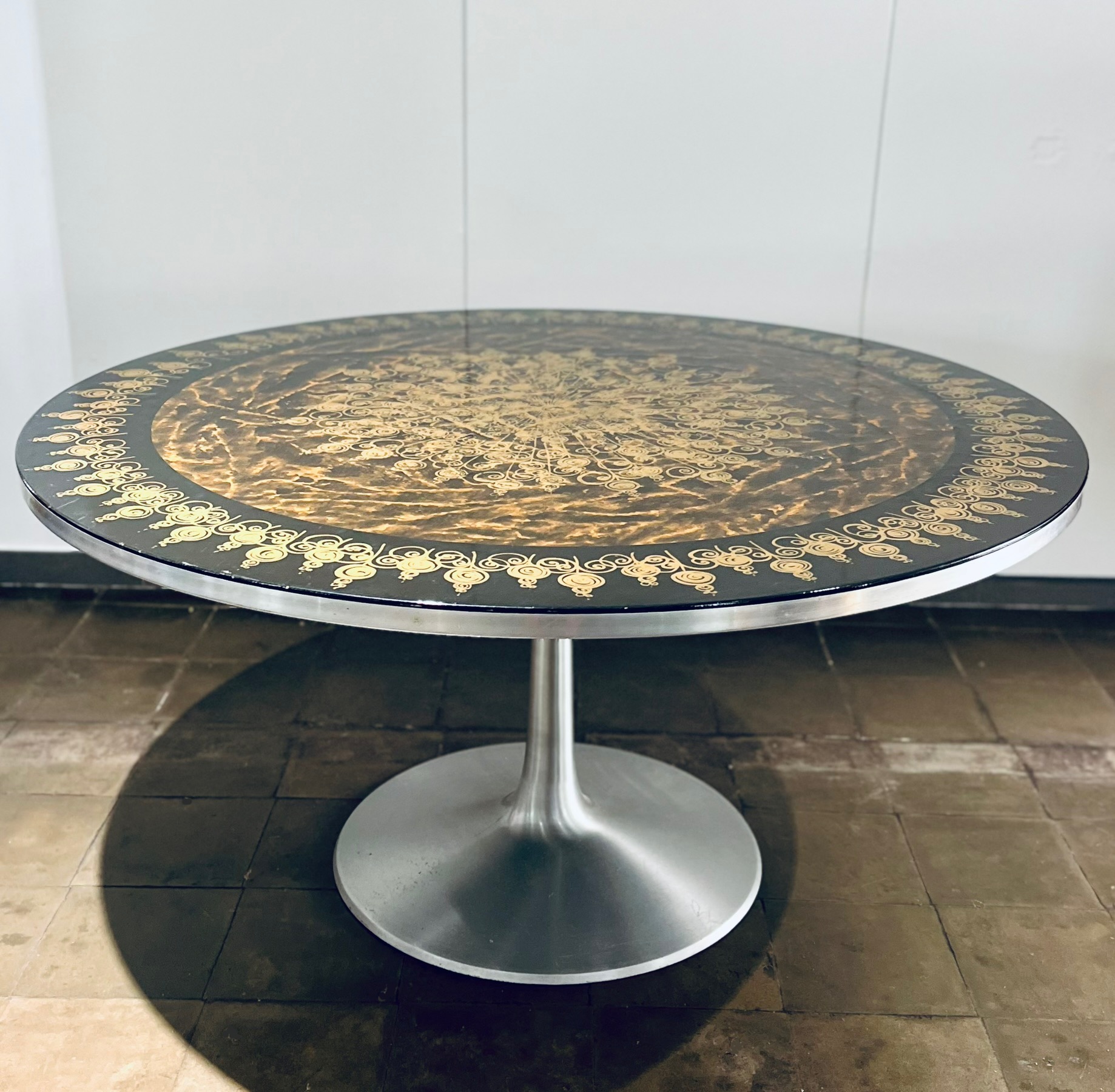 Gran Mesa de comedor, serie “Mosquito” de Poul Cadovius para Cado. Dinamarca años 60. Un pie de trompeta en aluminio cepillado, soporta una tapa de madera plastificada con anillo de aluminio. Y un fascinante trazado a mano alzada, con esmalte acrílico, diseñado y firmado por Susan Fjedldoe Mygge, decora su amplia superficie. Arte y diseño para esta hermosa pieza, la de mayor tamaño de una serie que cuenta con mesa de centro y de comedor de 118cm.
