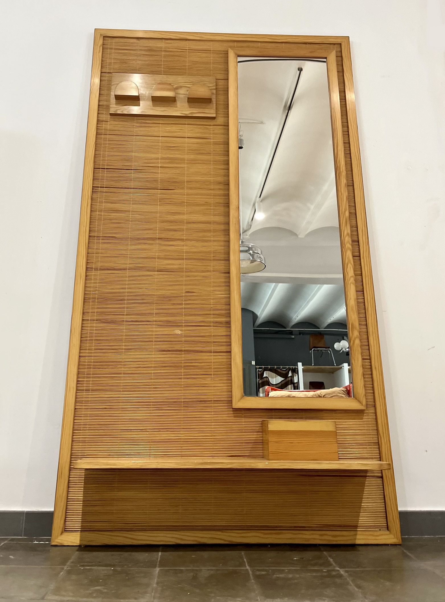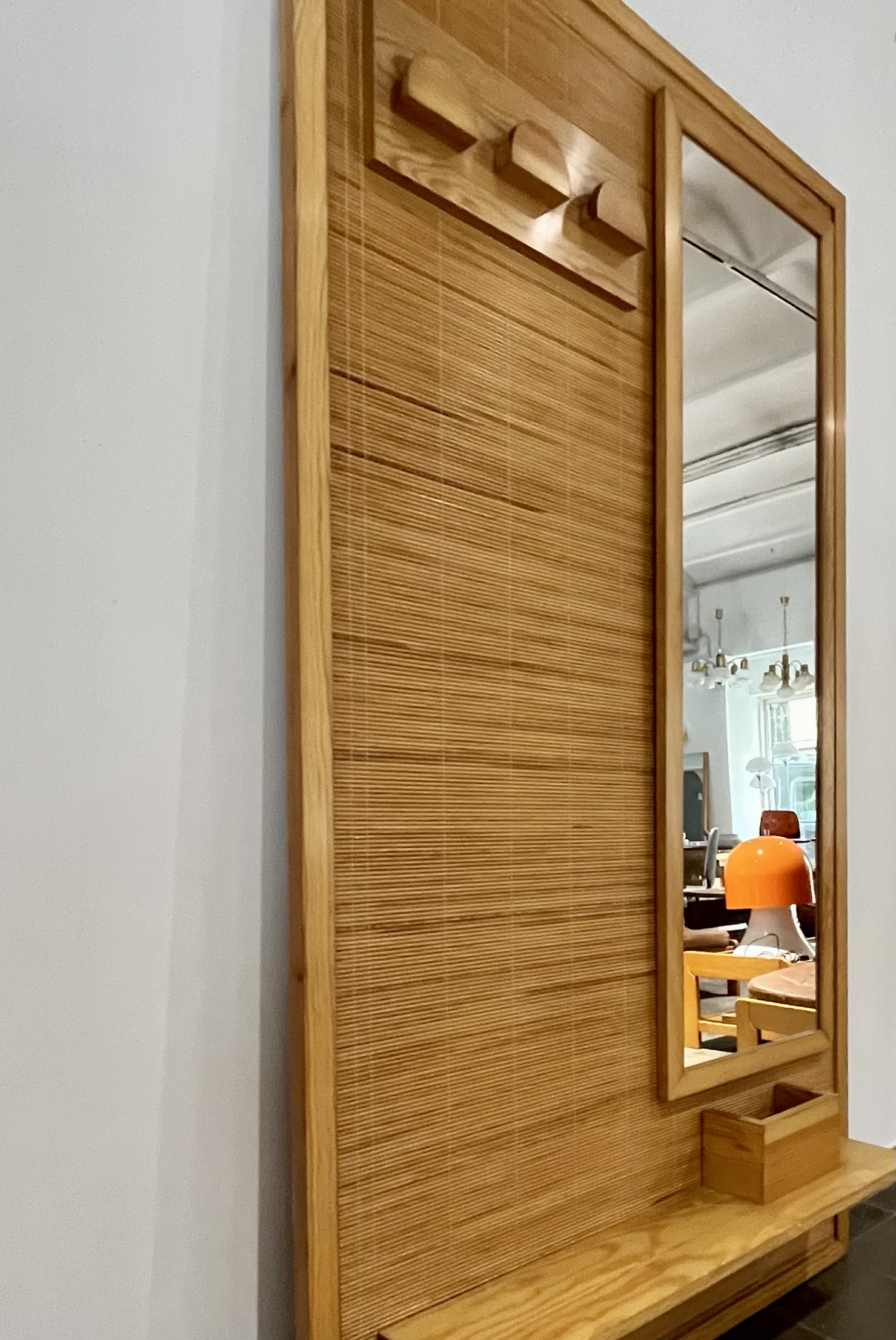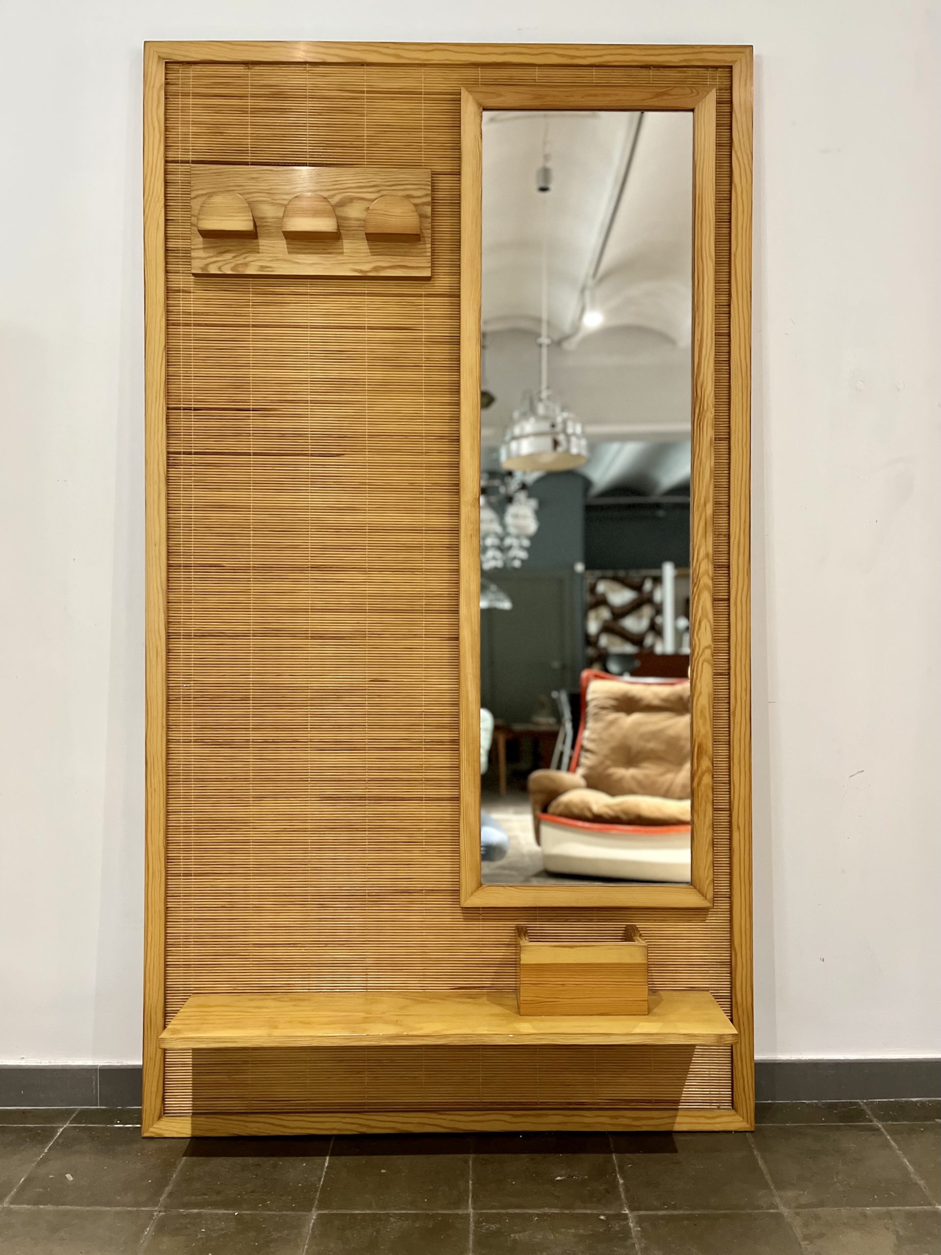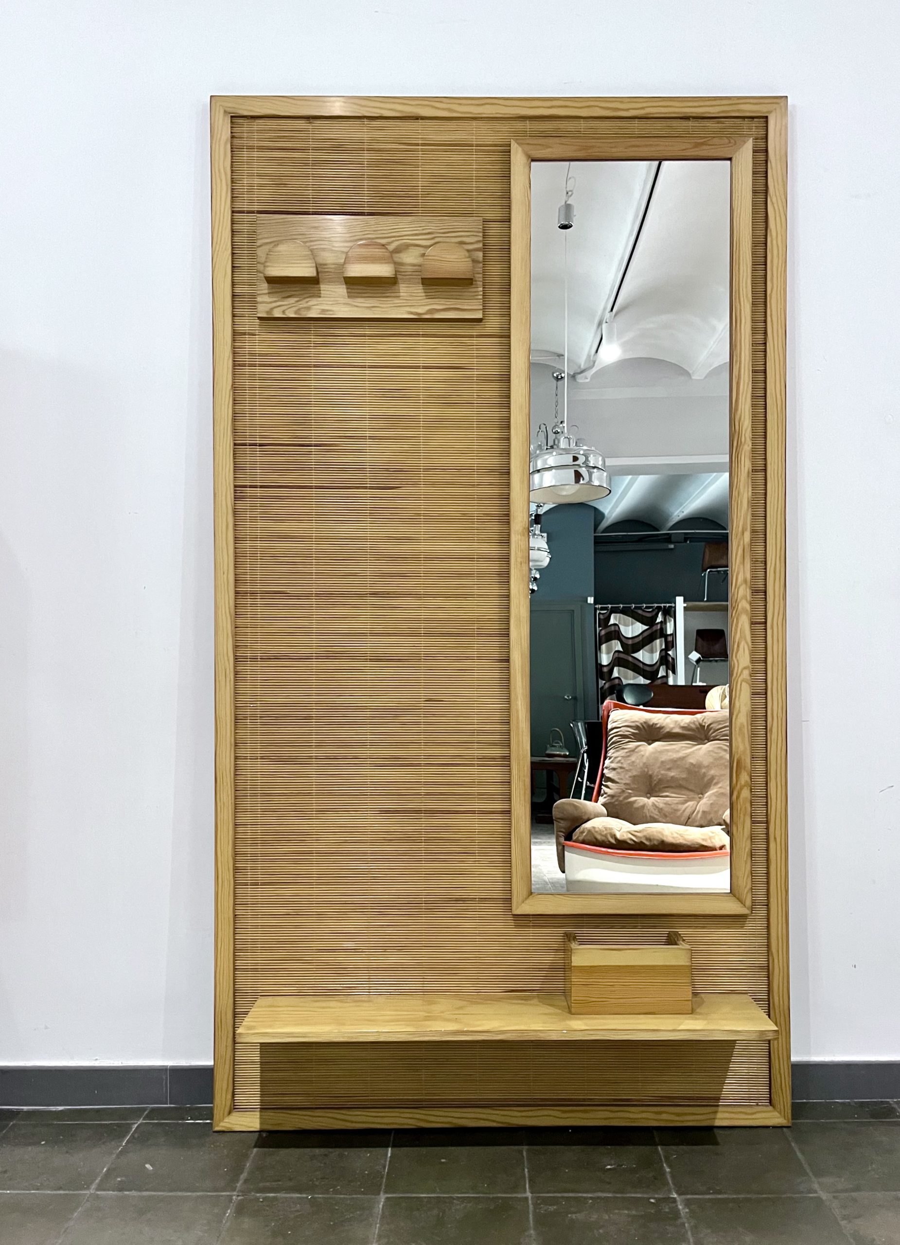 Perchero vintage con espejo, realizado de forma artesanal por carpintero local de Barcelona en los años 70. De estética moderna, con reminiscencias orientales, fue realizado con madera maciza de pino y tapizado con una trama en rollo de caña de calibre fino. Una pieza que no pasará desapercibida allí donde sea colocada, en entrada, descansillo, pasillo, vestidor… Búscale el lugar adecuado, dentro de tu hogar.
