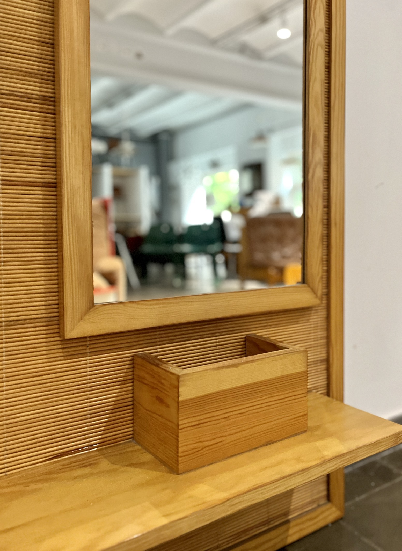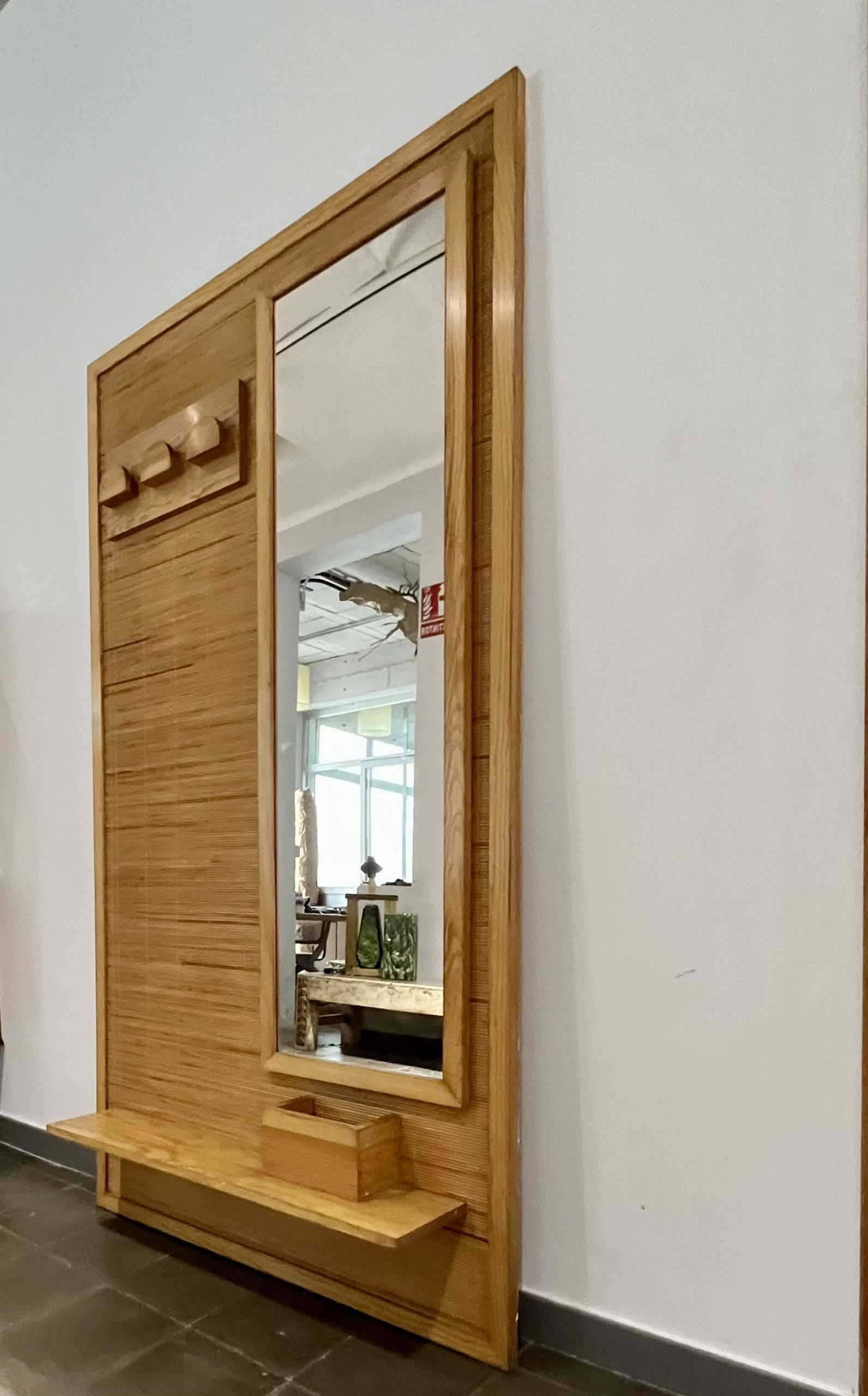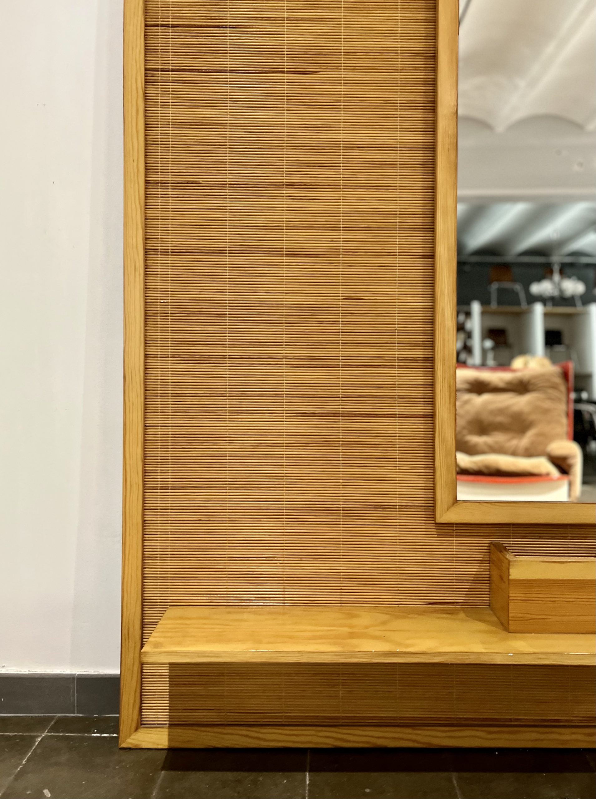 Perchero vintage con espejo, realizado de forma artesanal por carpintero local de Barcelona en los años 70. De estética moderna, con reminiscencias orientales, fue realizado con madera maciza de pino y tapizado con una trama en rollo de caña de calibre fino. Una pieza que no pasará desapercibida allí donde sea colocada, en entrada, descansillo, pasillo, vestidor… Búscale el lugar adecuado, dentro de tu hogar.