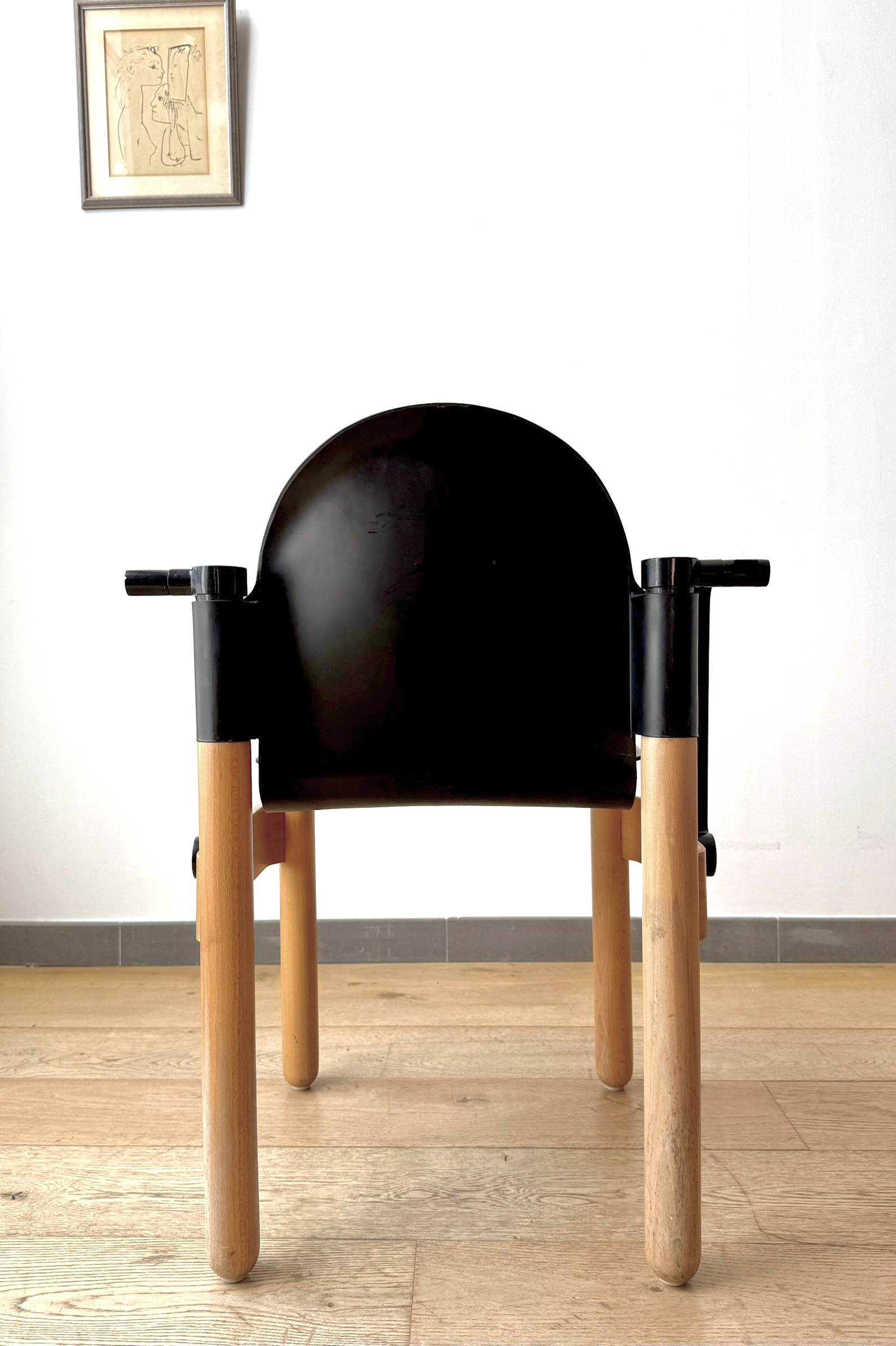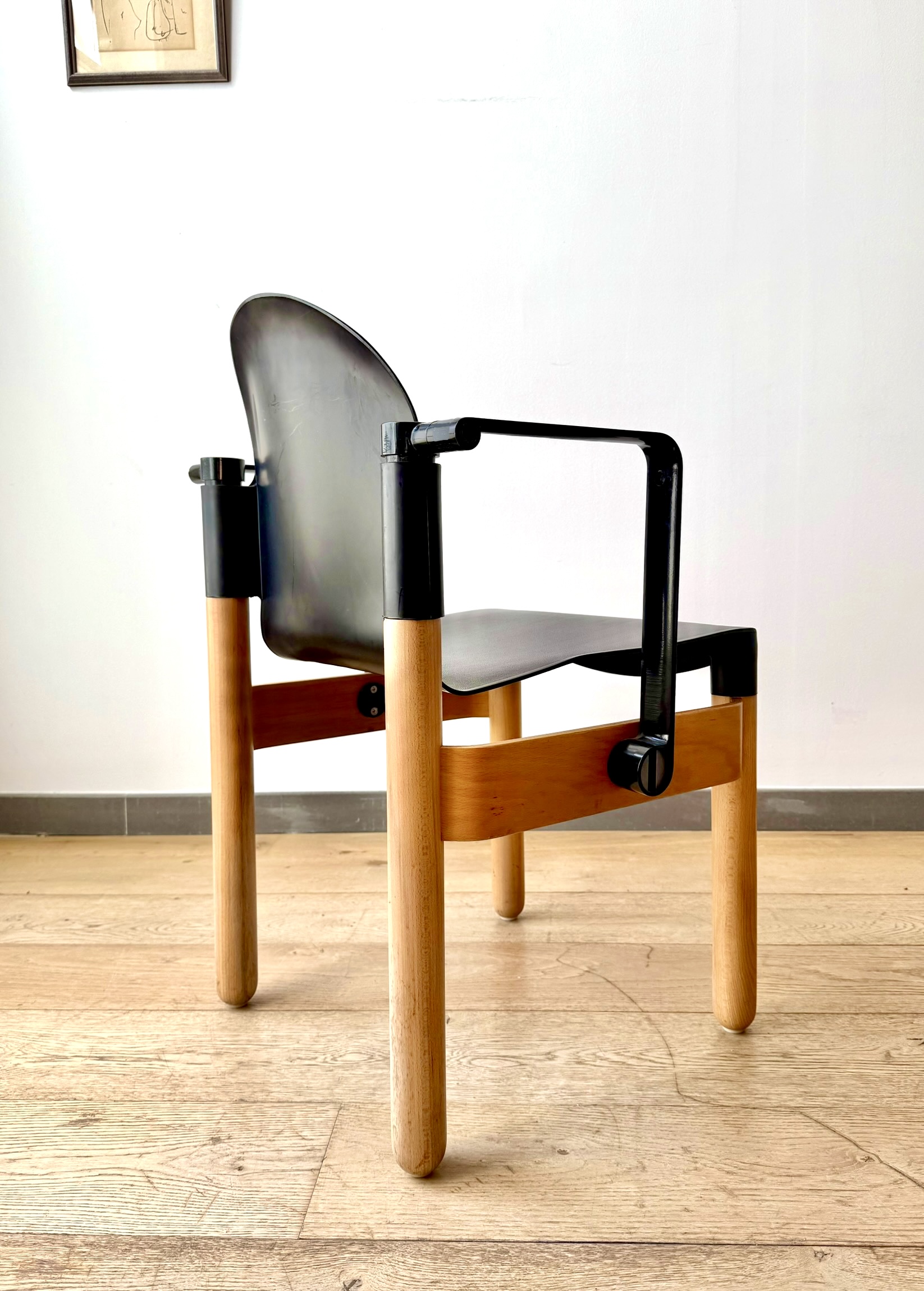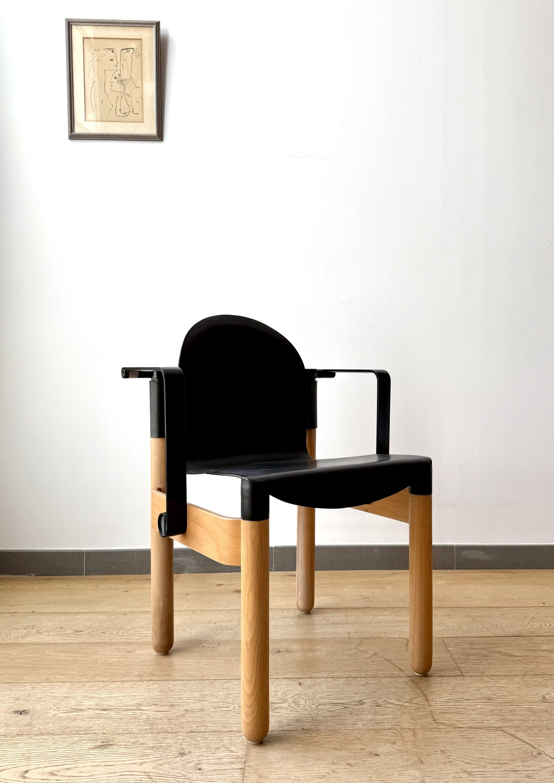 Sillas apilables con brazos, modelo Flex 2.000, diseño de Gerd Lange para Thonet. Alemania 1.974. Asientos y brazos de plástico negro termoformados y gruesas patas de madera macizas de haya. De un diseño vanguardista y muy tecnológico, son aptas para cualquier espacio.  Cuando Michel Thonet diseñó su primera silla de haya curvada con vapor en 1.836, su empresa revolucionó el movimiento moderno. Después de casi 2 siglos, Thonet sigue sorprendiendo con sus diseños, siempre innovadores y de excelentes acabados.