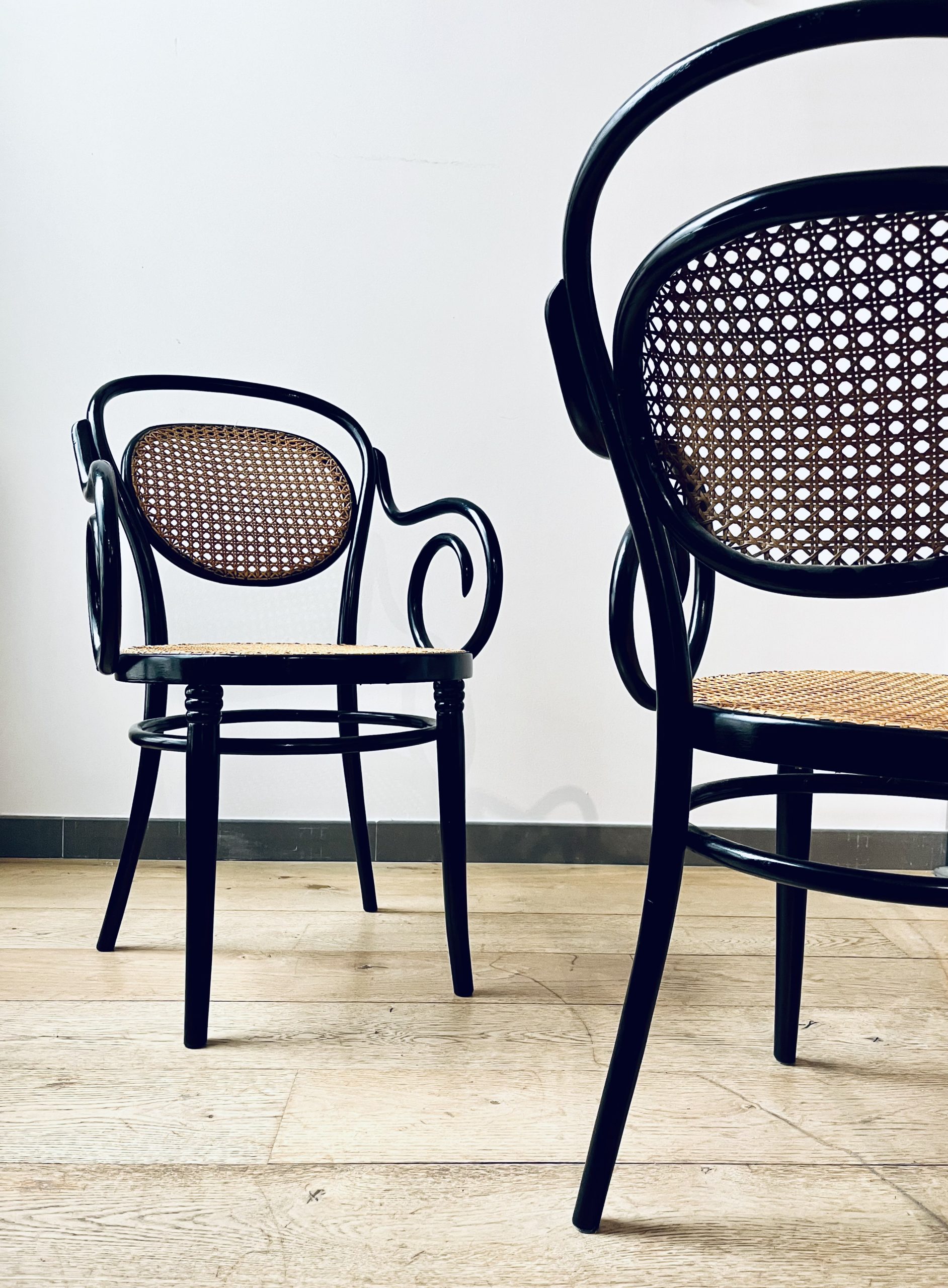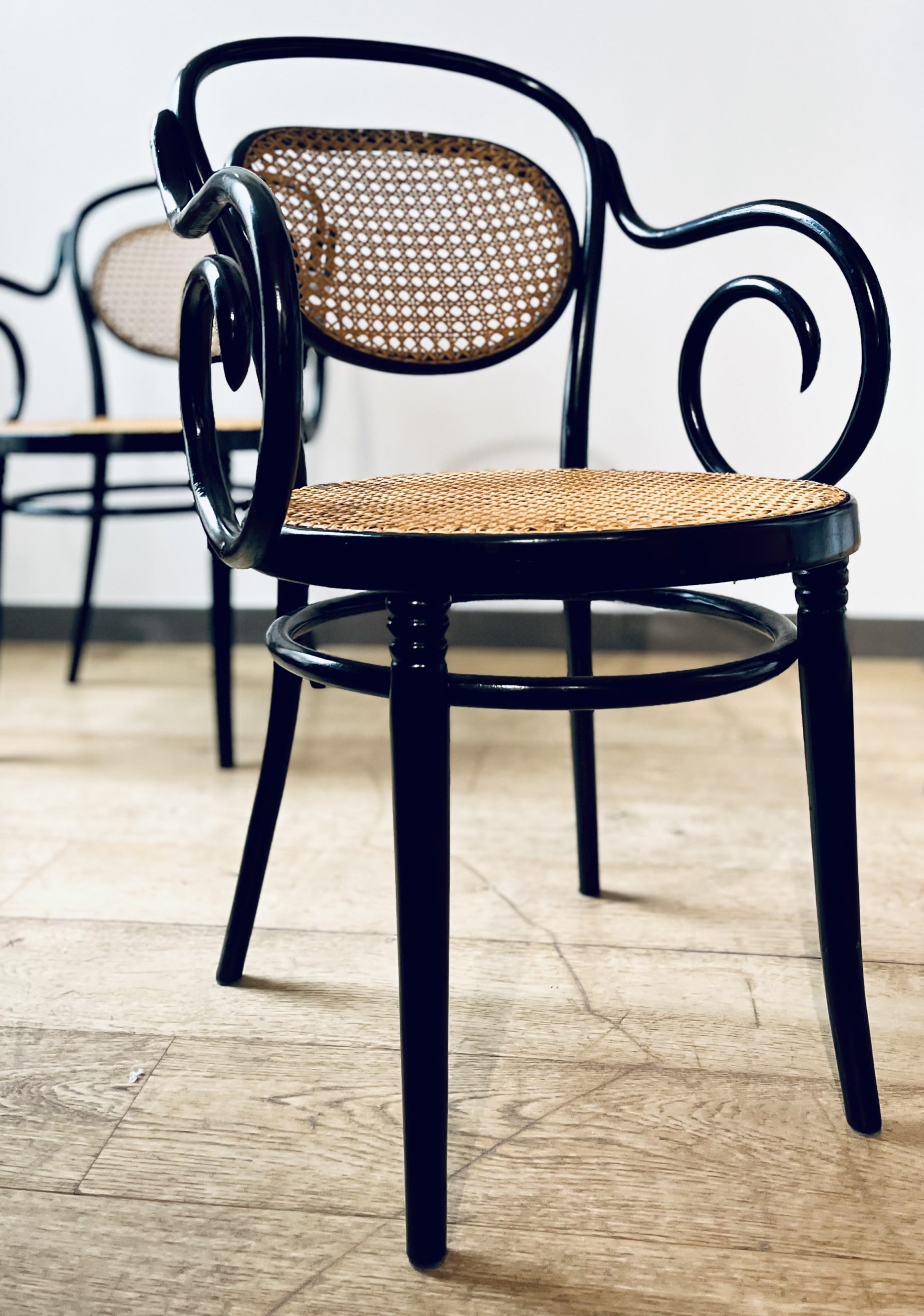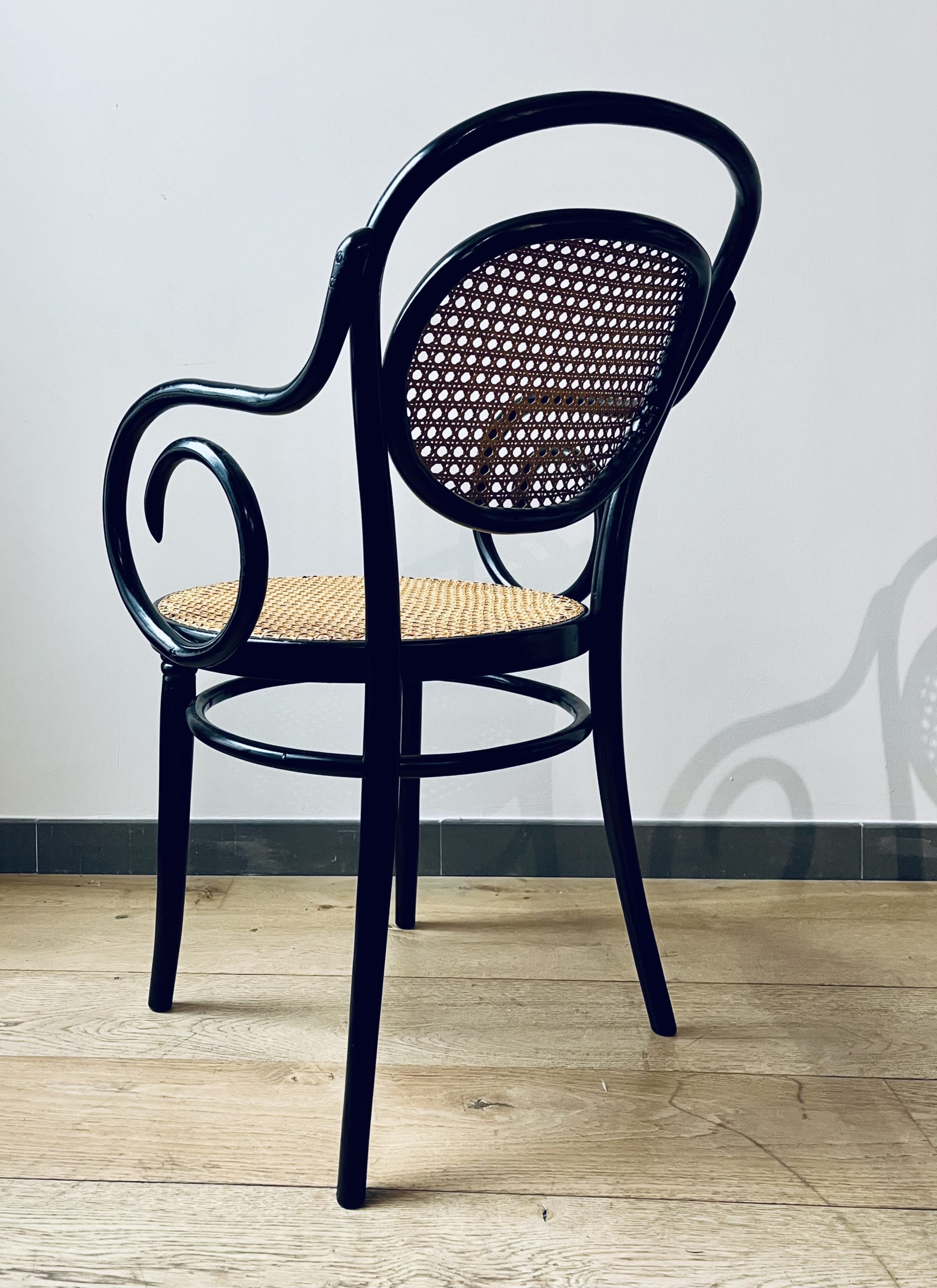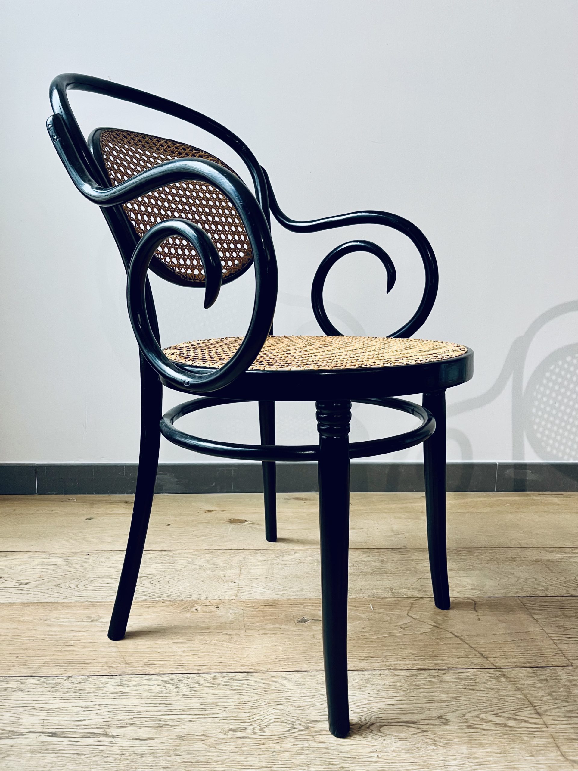 Silla Thonet, modelo número 11, diseño de Michael Thonet. Esta es una edición de ZPM Radomsko, hecha en Austria en los años 50. Llamada también Egon, este modelo de silla Thonet es de gran valor por su rareza y escasa producción. La singularidad de sus brazos las hace únicas. Belleza clásica con mucha elegancia. La madera curvada al vapor y ensamblada con tornillería sin encolado, lleva laca en color negro de origen. Las rejillas trenzadas a mano con fibras vegetales, hebra a hebra, se van entrelazando de forma artesanal, con la filosofía del trabajo bien hecho, donde la calidad prima ante la velocidad del acabado. Nuestros artesanos requieren más de 20 horas por silla, para completar los bastidores de madera.