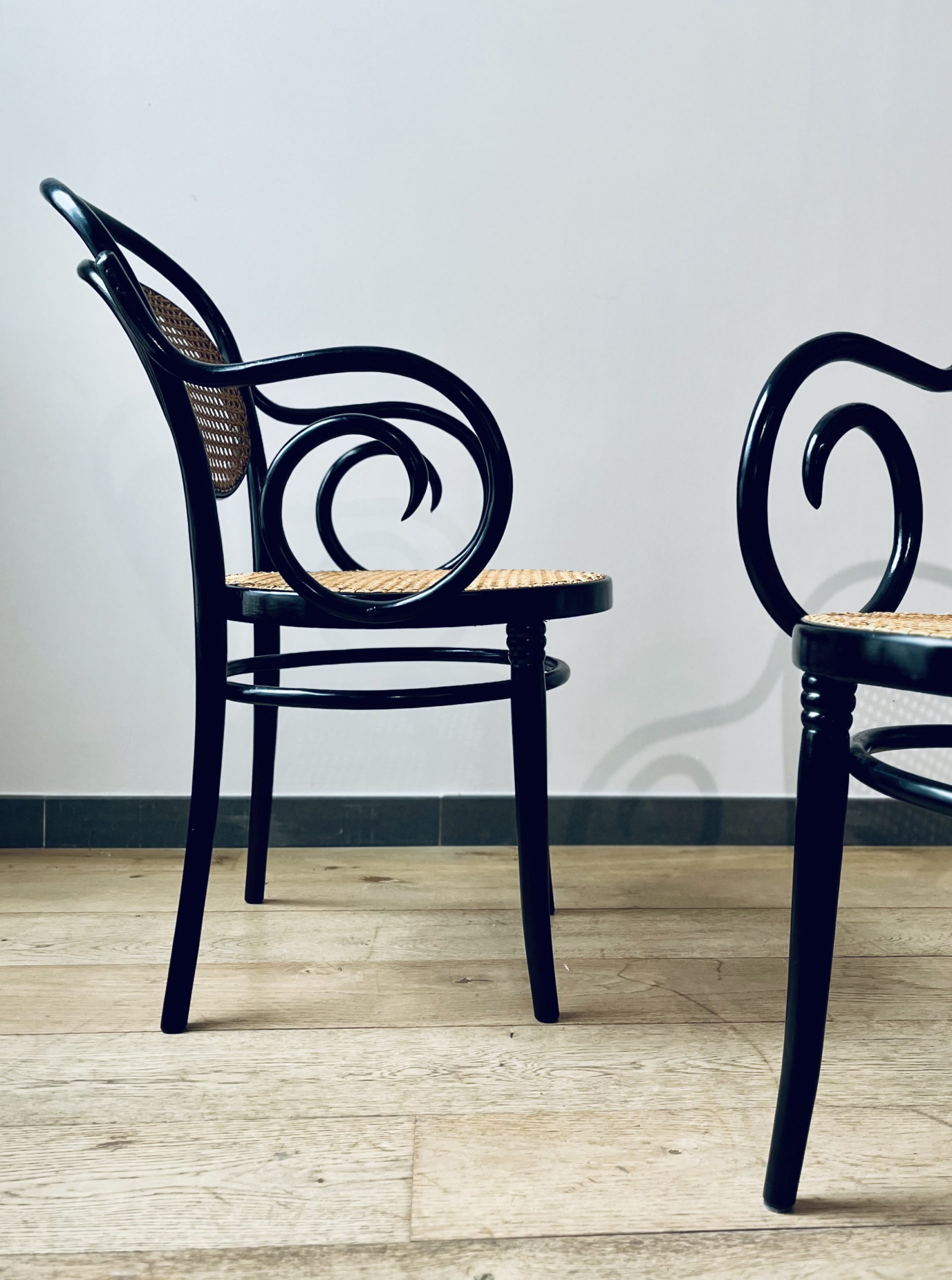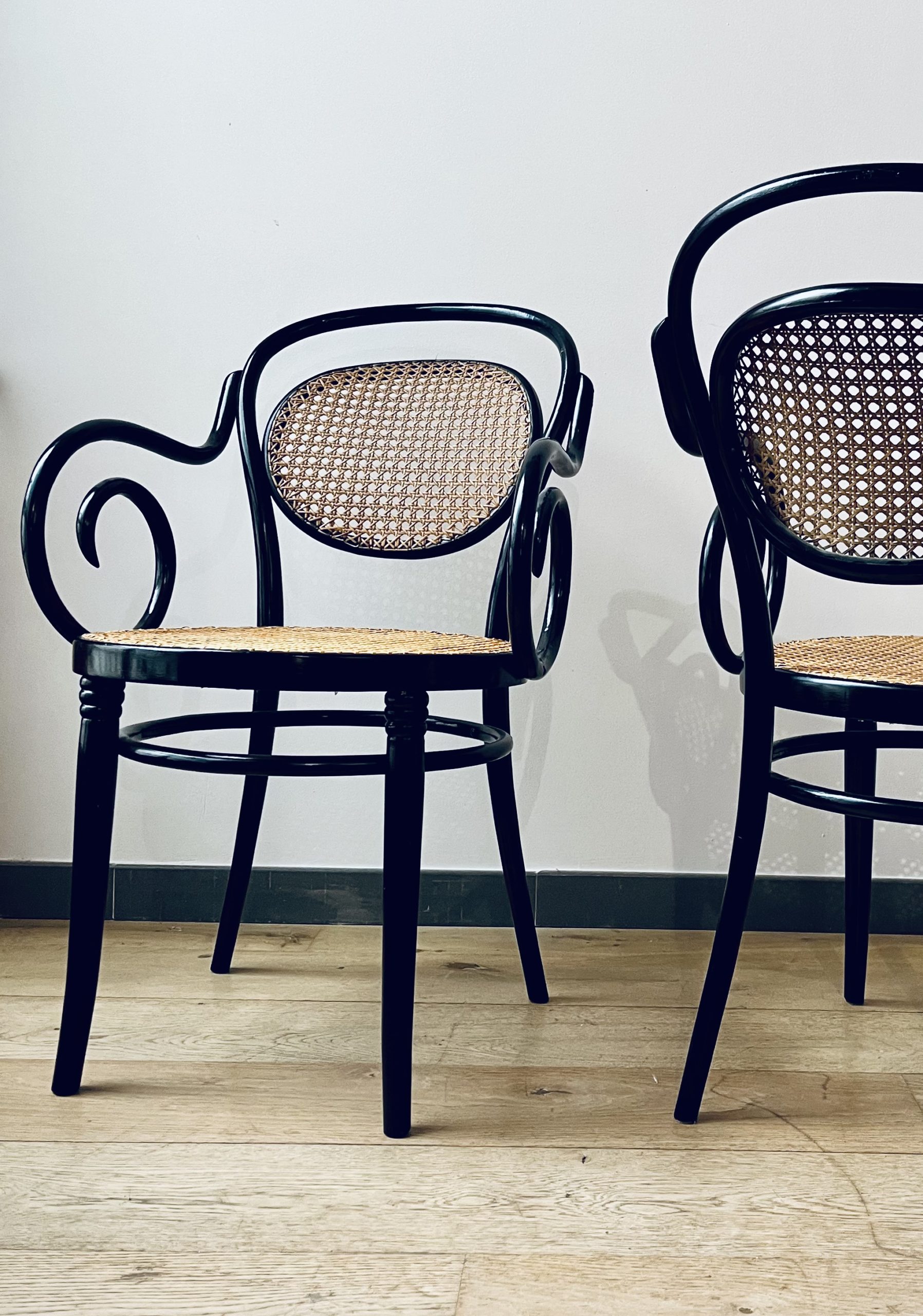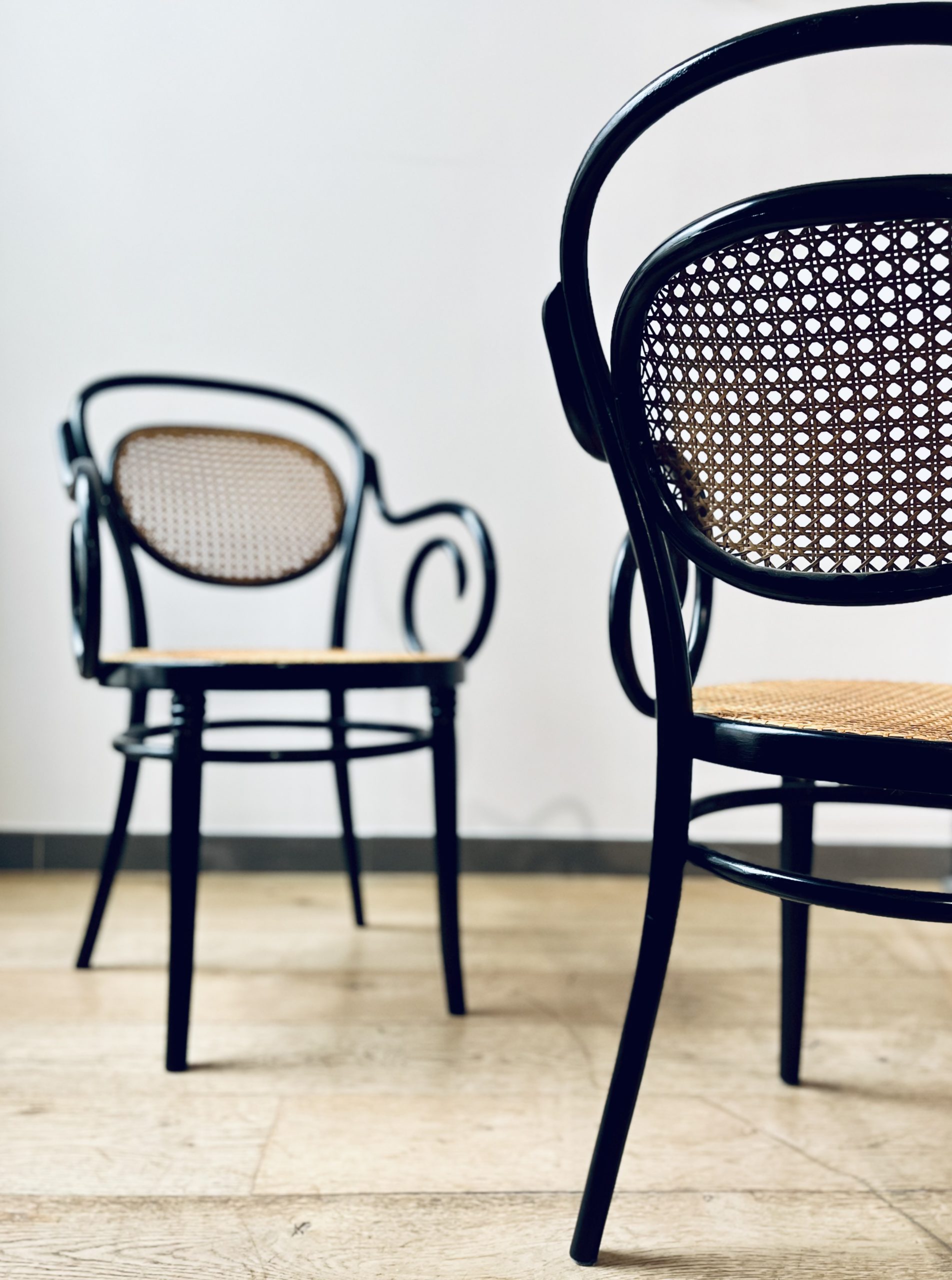 Silla Thonet, modelo número 11, diseño de Michael Thonet. Esta es una edición de ZPM Radomsko, hecha en Austria en los años 50. Llamada también Egon, este modelo de silla Thonet es de gran valor por su rareza y escasa producción. La singularidad de sus brazos las hace únicas. Belleza clásica con mucha elegancia. La madera curvada al vapor y ensamblada con tornillería sin encolado, lleva laca en color negro de origen. Las rejillas trenzadas a mano con fibras vegetales, hebra a hebra, se van entrelazando de forma artesanal, con la filosofía del trabajo bien hecho, donde la calidad prima ante la velocidad del acabado. Nuestros artesanos requieren más de 20 horas por silla, para completar los bastidores de madera.