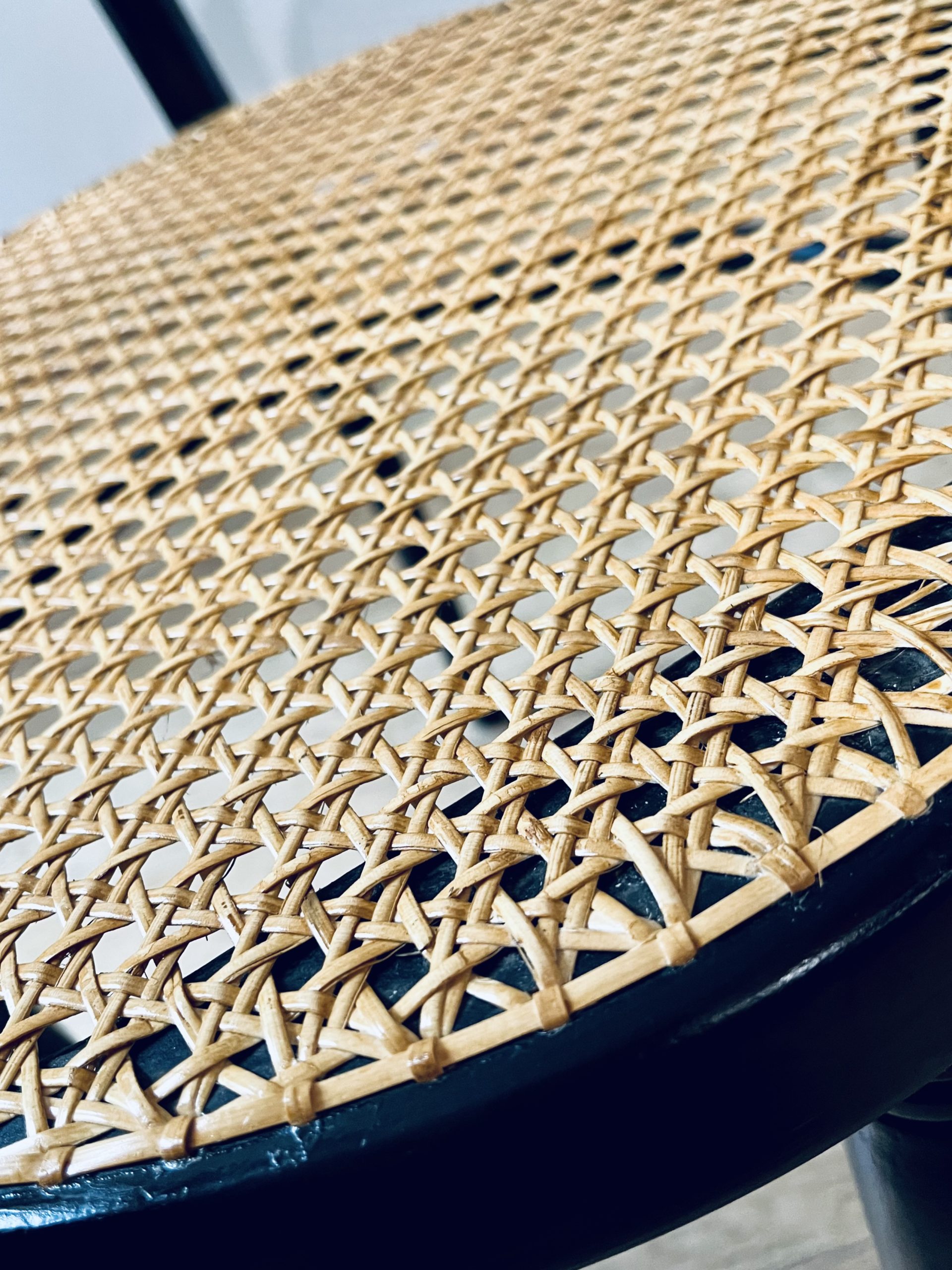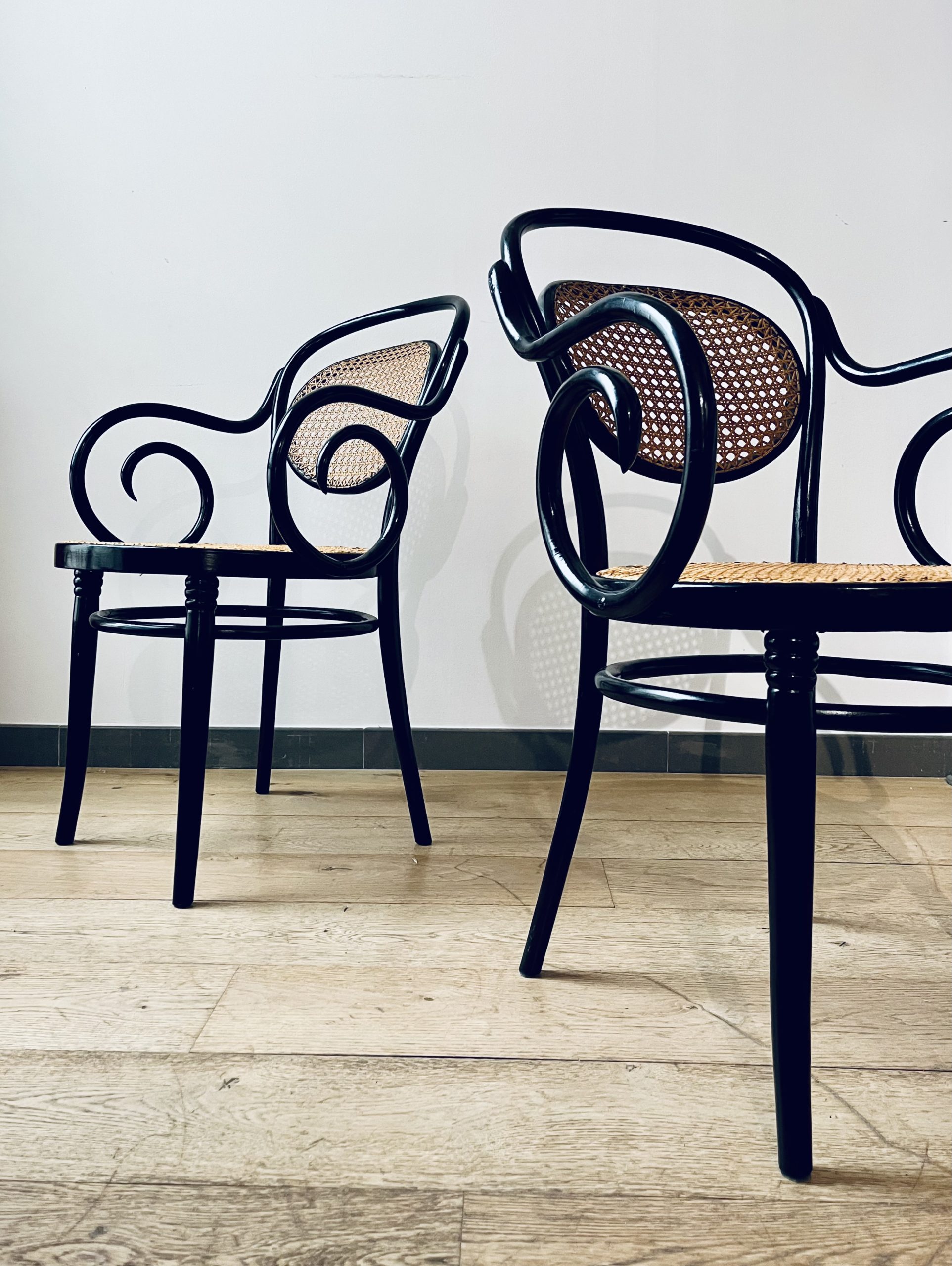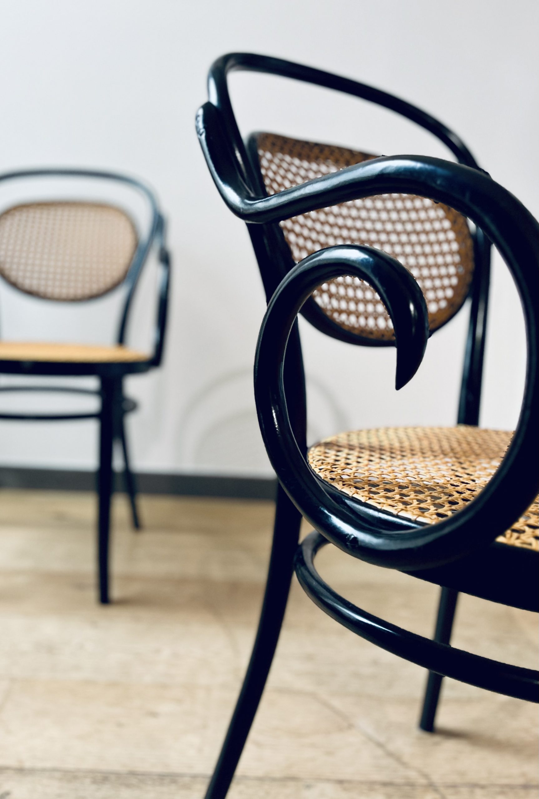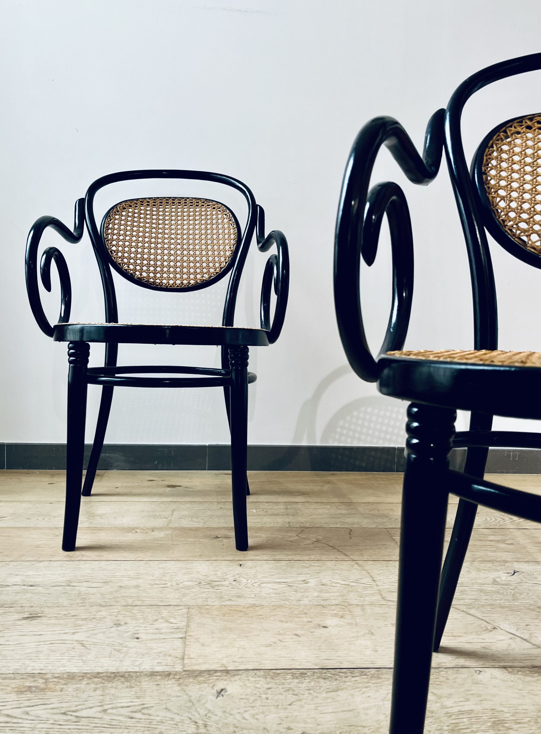 Silla Thonet, modelo número 11, diseño de Michael Thonet. Esta es una edición de ZPM Radomsko, hecha en Austria en los años 50. Llamada también Egon, este modelo de silla Thonet es de gran valor por su rareza y escasa producción. La singularidad de sus brazos las hace únicas. Belleza clásica con mucha elegancia. La madera curvada al vapor y ensamblada con tornillería sin encolado, lleva laca en color negro de origen. Las rejillas trenzadas a mano con fibras vegetales, hebra a hebra, se van entrelazando de forma artesanal, con la filosofía del trabajo bien hecho, donde la calidad prima ante la velocidad del acabado. Nuestros artesanos requieren más de 20 horas por silla, para completar los bastidores de madera.