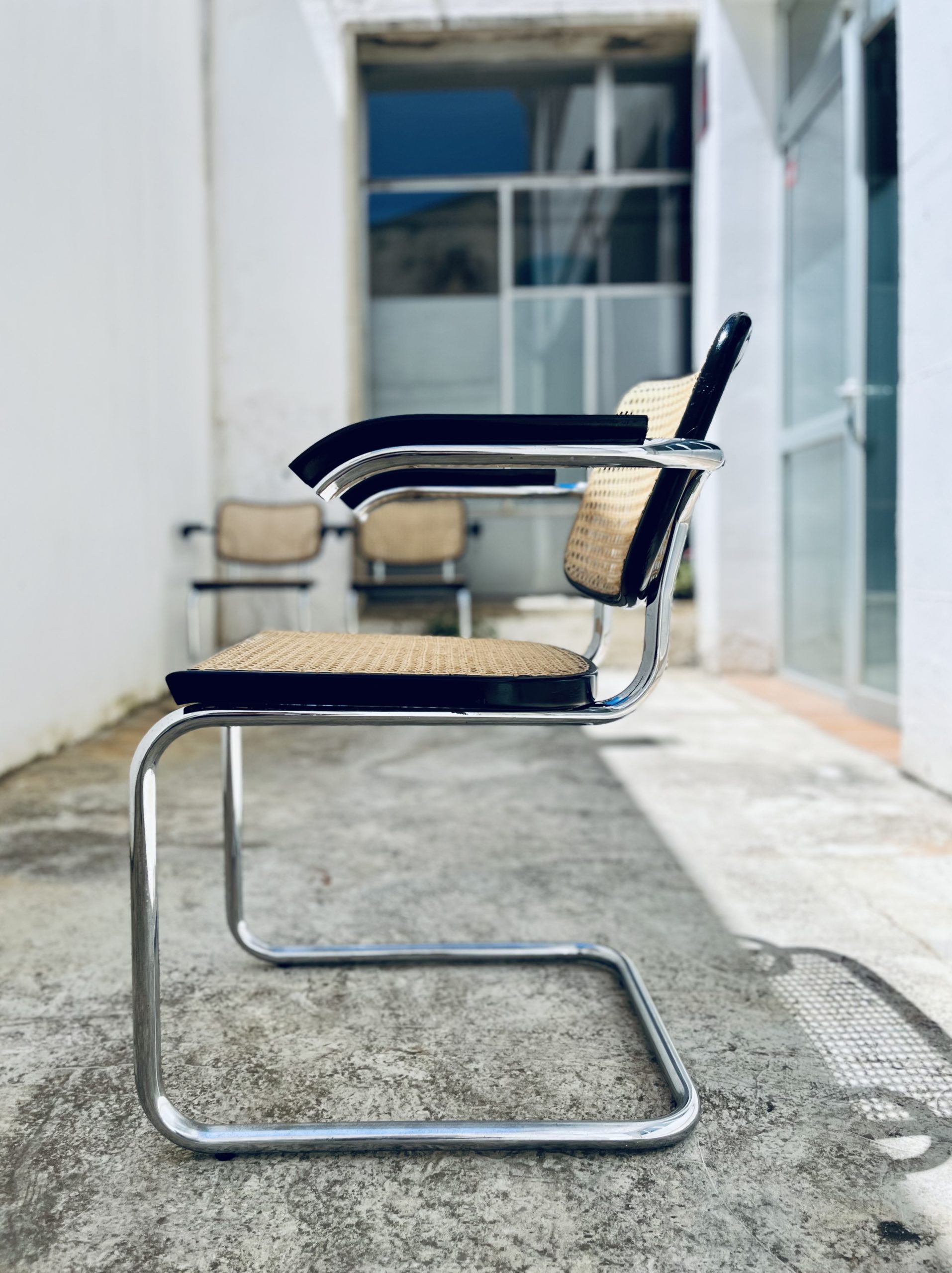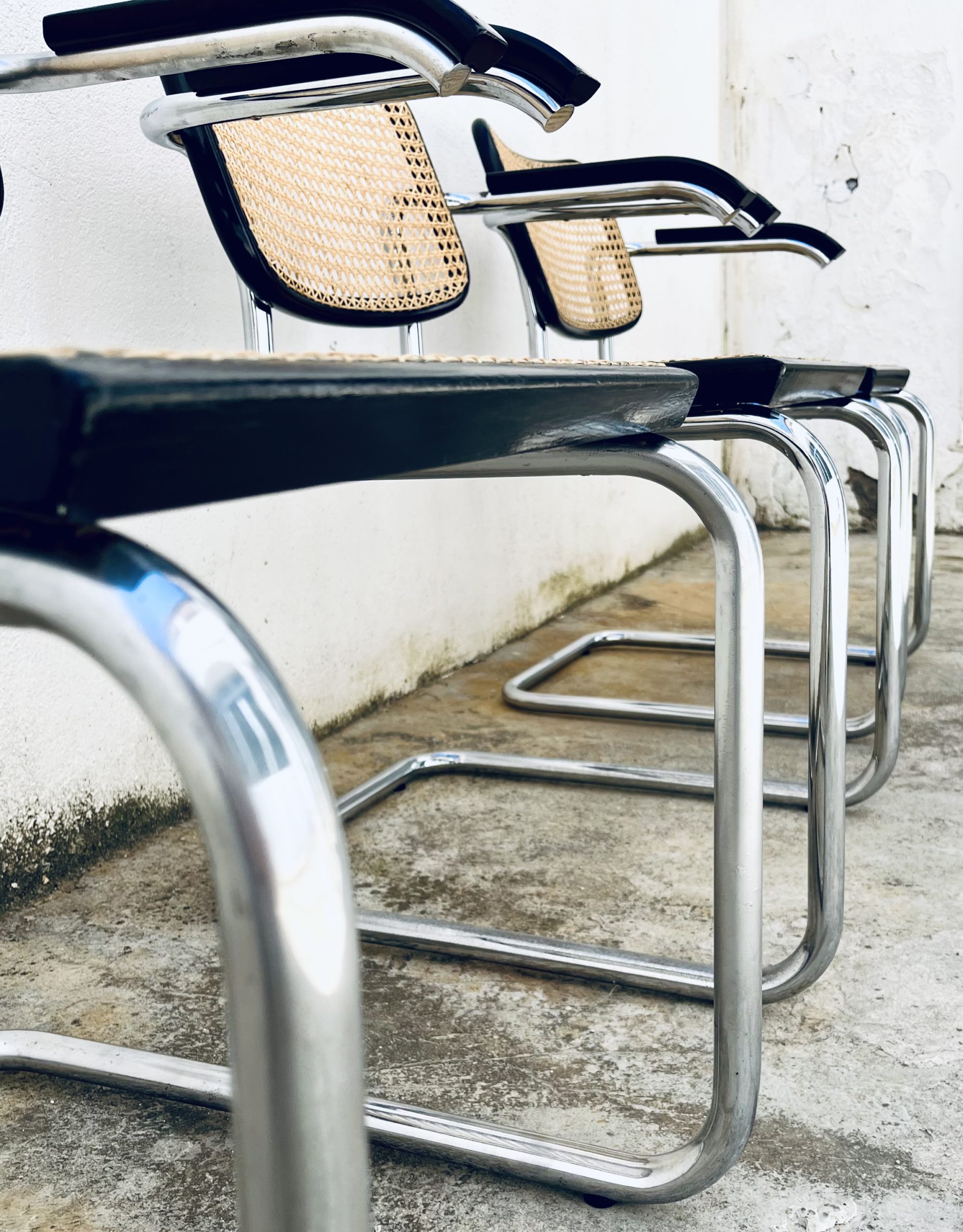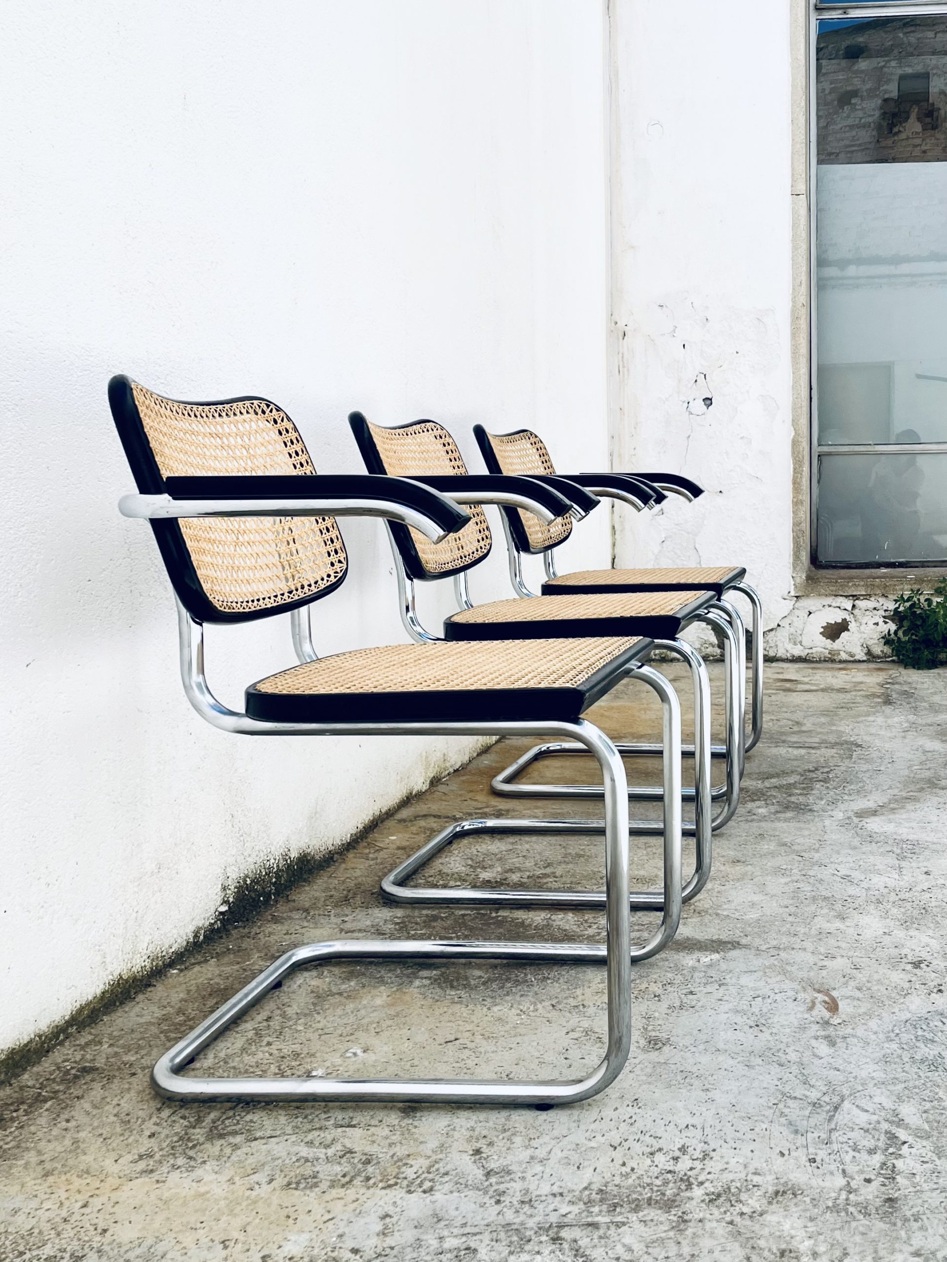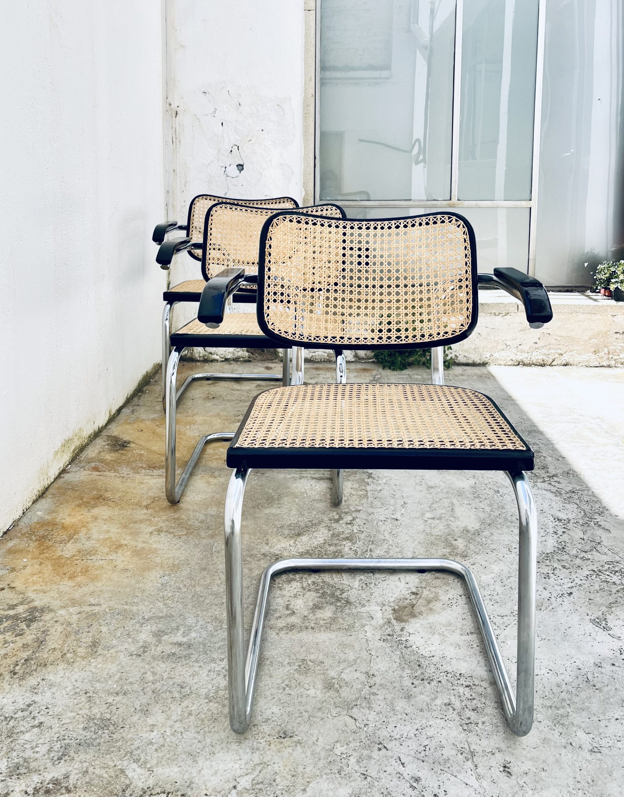 Estas sillas Cesca, diseño original de Marcel Breuer de 1.928, son de gran belleza y calidad, además de una rareza por su edición. Los tubos cromados son de una sola pieza (sin tapones a los extremos). El respaldo asemeja la forma de un corazón. Y la amplitud de sus dimensiones y la calidad de los materiales, la hacen inconfundible ante sus réplicas contemporáneas. Las rejillas trenzadas a mano con fibras vegetales, hebra a hebra, se van entrelazando de forma artesanal, con la filosofía del trabajo bien hecho, donde la calidad prima ante la velocidad del acabado. Nuestros artesanos requieren más de 20 horas por silla, para completar los bastidores de madera. Esta edición Gavina, sólo es comparable con la de Thonet o Knoll. Hechas en España, por la empresa MYC, en una década (los 60 y principio de los 70), que la fabricación de mobiliario de diseño internacional, estaba nacionalizada en nuestro país. Por este motivo, se trata de una rareza temporal, única e irrepetible. Adquirir estas edición, es formar parte de la historia de las sillas más icónicas del diseño. Y una inversión de futuro ya que seguirán revalorizándose con el tiempo.